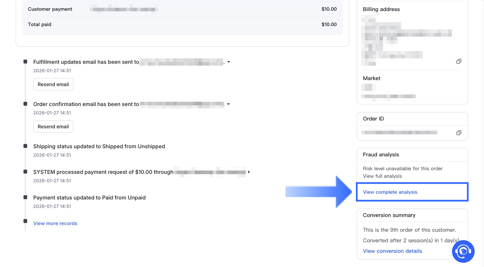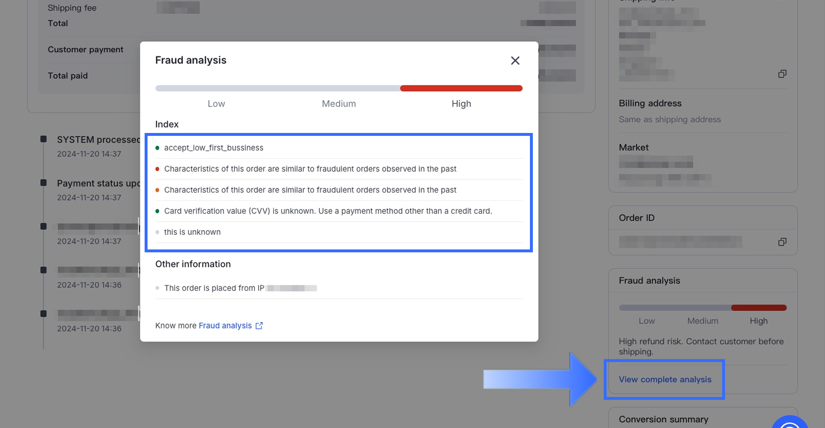Trong phần Phân tích gian lận, nhấp vào Xem phân tích đầy đủ để xem xét nhiều chỉ số gian lận liên quan đến đơn hàng. Những chỉ số này cung cấp manh mối điều tra nhưng không cấu thành bằng chứng trực tiếp về gian lận.