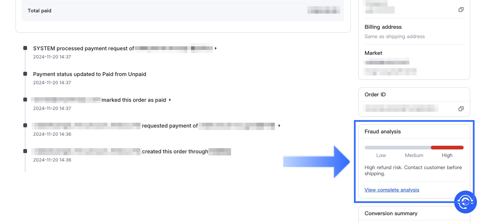 Trên trang chi tiết đơn hàng, tìm phần Phân tích gian lận.