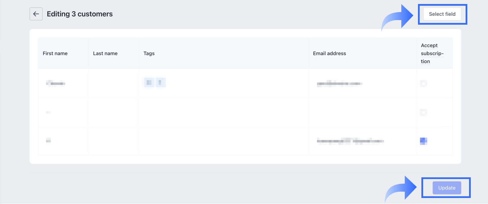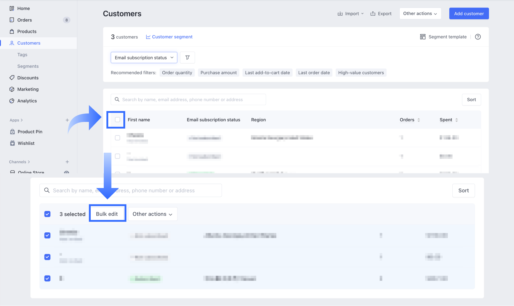 Trên trang quản lý khách hàng, bạn có thể sử dụng chỉnh sửa hàng loạt để đồng thời cập nhật nhiều hồ sơ khách hàng. Bạn có thể chọn nhiều hoặc tất cả hồ sơ khách hàng trong cửa hàng bằng các phương pháp sau: