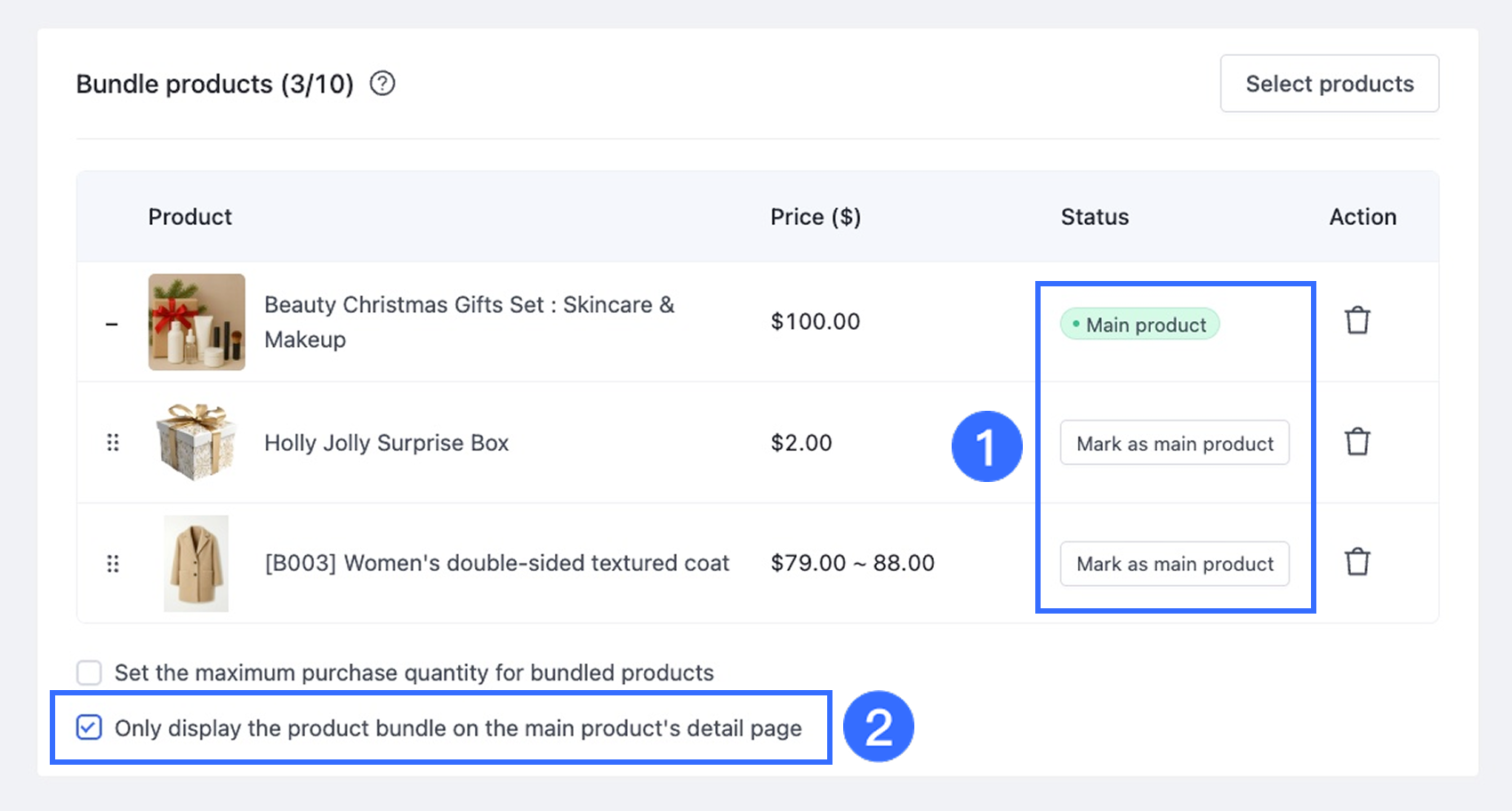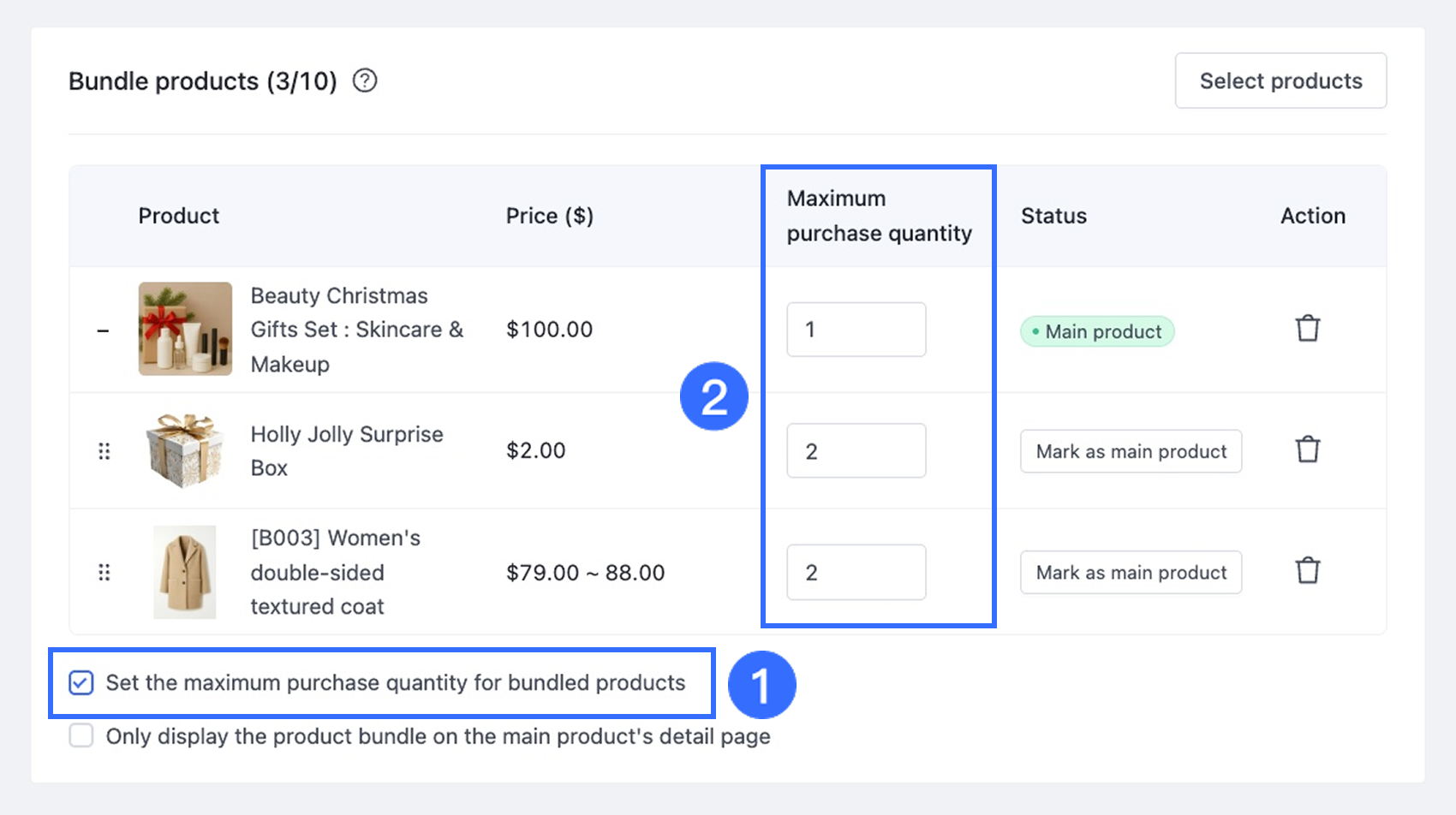 Nếu cần, chọn Đặt số lượng mua tối đa cho các sản phẩm trong gói để xác định số lượng tối đa khách hàng có thể mua cho mỗi sản phẩm trên trang chi tiết sản phẩm.