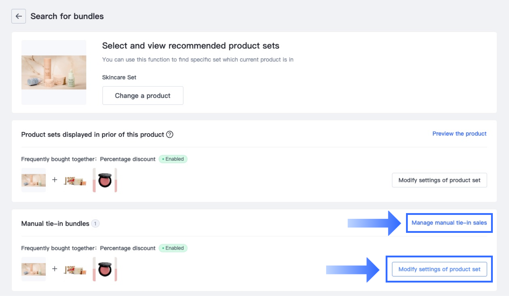 Trong ứng dụng Product Upsells & Bundles, vào tab Product bundles, tìm module "Manual tie-in sets", và nhấp vào Manage bundles.
