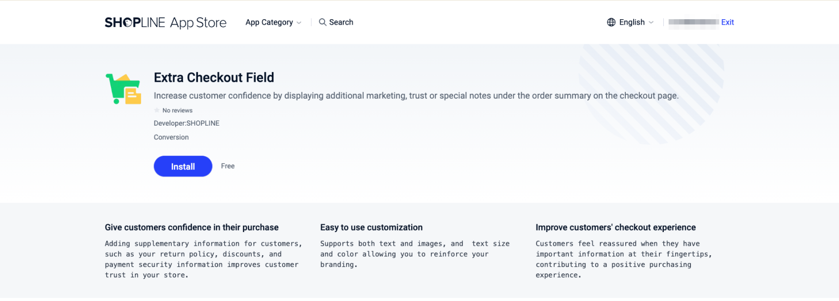 Truy cập vào Cửa Hàng Ứng Dụng SHOPLINE, tìm kiếm Trường Thêm Khi Thanh Toán, và nhấp vào Cài Đặt. Hệ thống sẽ hướng dẫn bạn đến ứng dụng.