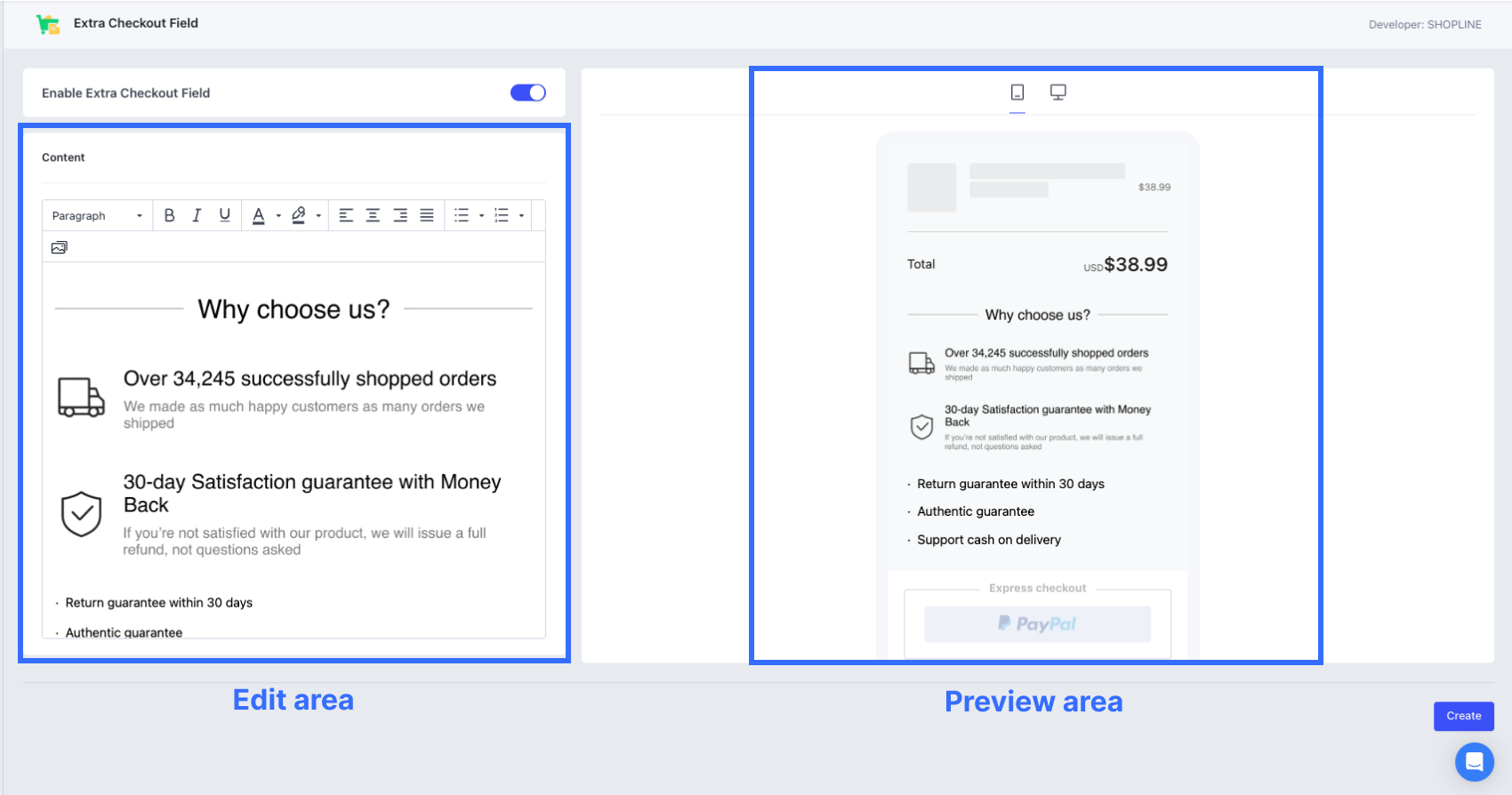 Ở bên trái, SHOPLINE cung cấp một mẫu nội dung mà bạn có thể tự do chỉnh sửa và thay đổi. Các thay đổi của bạn có thể được xem trước theo thời gian thực trong khu vực hiển thị bên phải. Tính năng này được bật theo mặc định, và bạn có thể chuyển đổi công tắc bất cứ lúc nào.