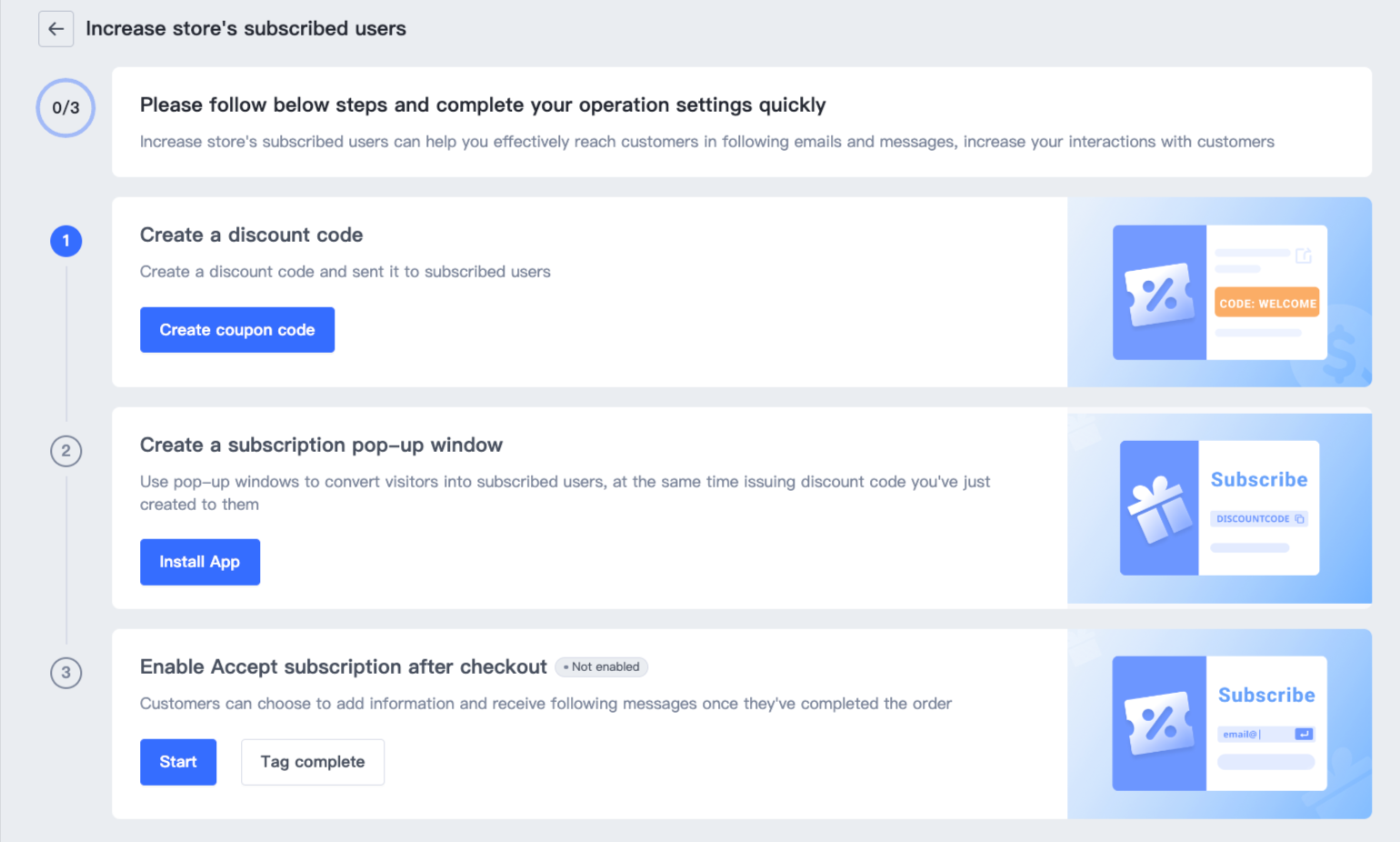 - Bạn có thể trực tiếp nhấp vào Bắt đầu để đi đến trang cấu hình giải pháp và làm theo các bước để tạo mã giảm giá và cửa sổ pop-up đăng ký, và bạn cũng có thể kích hoạt chấp nhận đăng ký sau khi thanh toán.