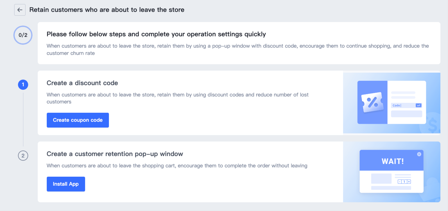 Giải pháp này chủ yếu giúp bạn tăng cường giữ chân và giảm tỷ lệ thoát của cửa hàng. Bạn có thể tạo một cửa sổ pop-up giữ chân khách hàng và hiển thị nó khi một khách hàng sắp rời khỏi trang, và hiển thị mã giảm giá trong pop-up để giữ chân khách hàng đặt hàng và giảm tỷ lệ thoát của cửa hàng.