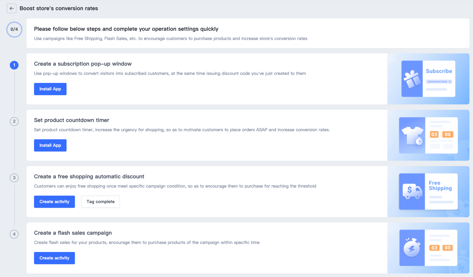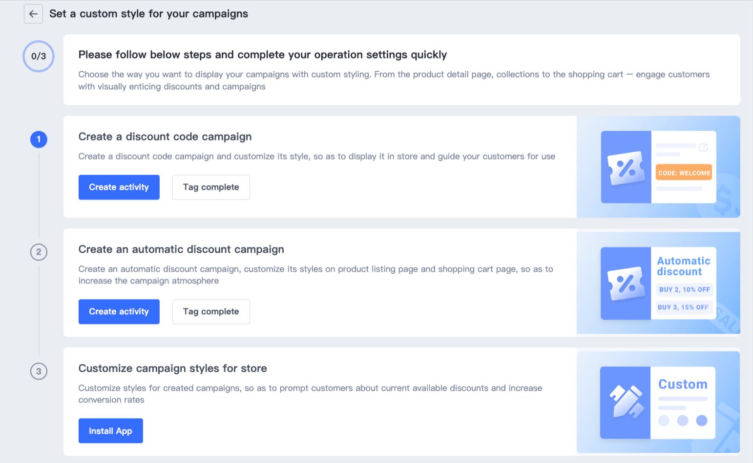 - Bạn có thể trực tiếp nhấp vào Bắt đầu để đi đến trang giải pháp, đi đến chiến dịch giảm giá, tạo mã giảm giá và giảm giá tự động, và nhấp vào Hoàn thành thẻ trong giải pháp sau khi tạo. Để biết chi tiết về quy trình tạo các chiến dịch giảm giá, bạn có thể tham khảo Mã Giảm Giá.