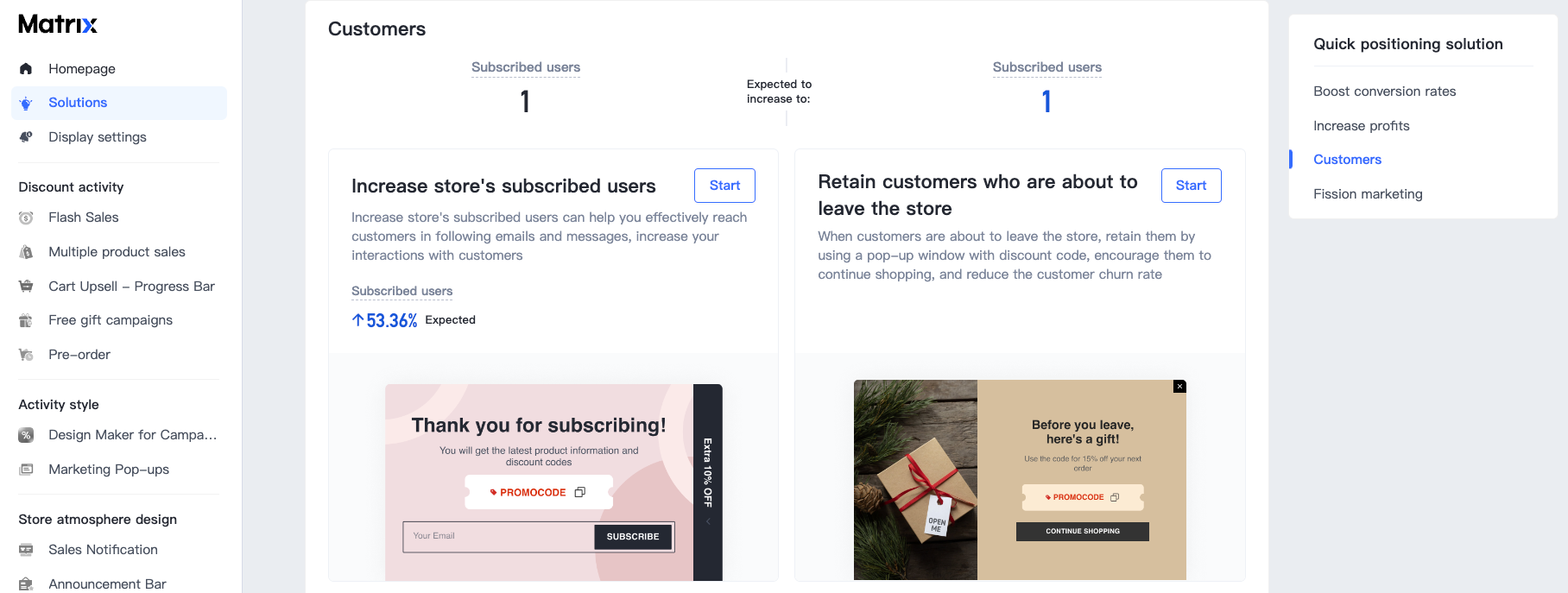 Các giải pháp hoạt động khách hàng cho bạn thấy số lượng người dùng đăng ký hiện tại trong cửa hàng và ước tính sự gia tăng tiềm năng của người dùng đăng ký sau khi cấu hình tất cả các giải pháp trong danh mục này. Nếu bạn đang cấu hình một giải pháp, nó cung cấp cho bạn dữ liệu so sánh, cho thấy tỷ lệ phần trăm tăng trước và sau khi cấu hình, giúp bạn dễ dàng so sánh dữ liệu.
