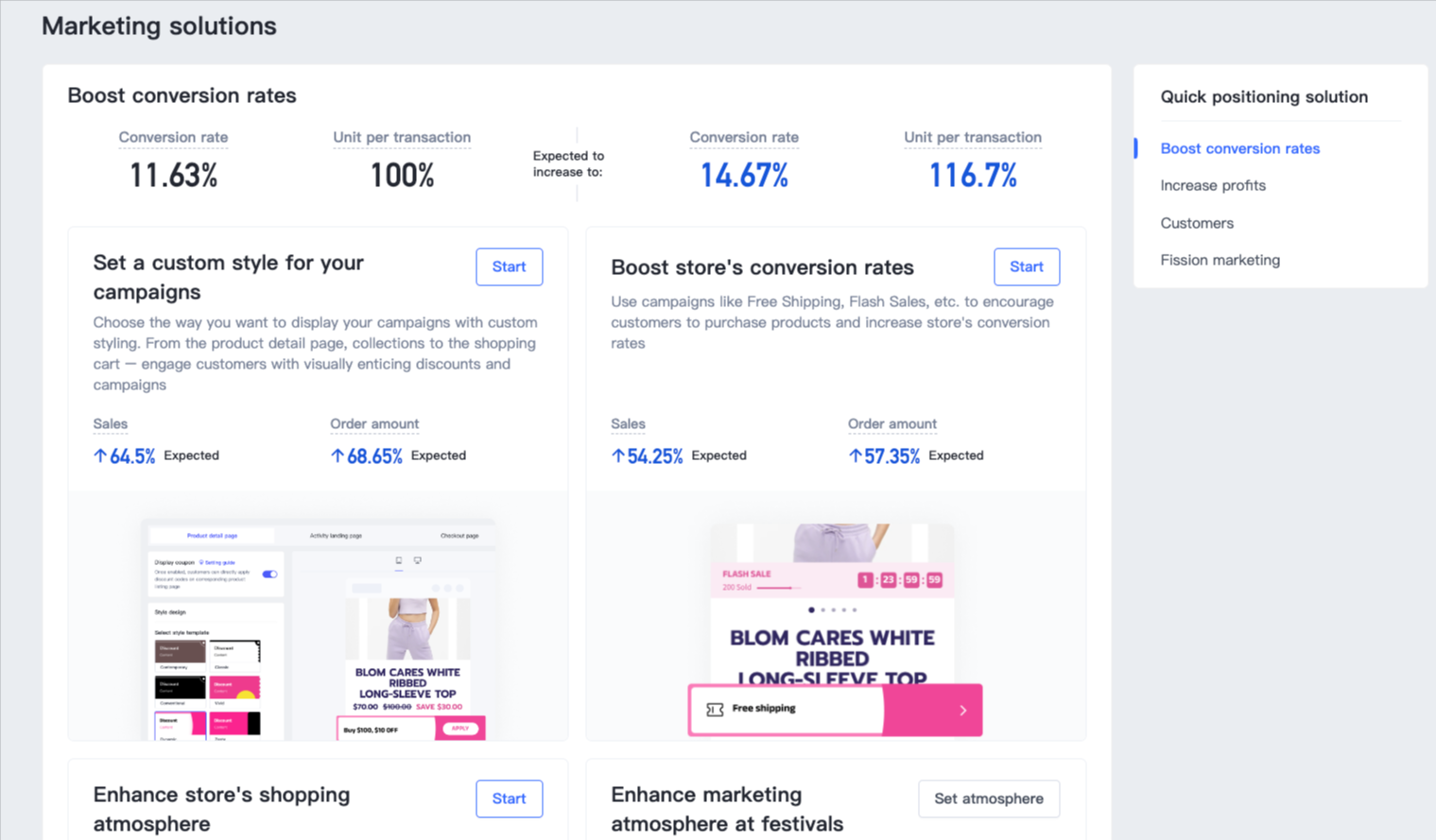 - Bạn có thể nhấp trực tiếp vào Bắt đầu để đến trang giải pháp, và tạo một cửa sổ pop-up đăng ký, bộ đếm ngược sản phẩm, giảm giá tự động cho việc mua sắm miễn phí, chiến dịch giảm giá chớp nhoáng để thúc đẩy việc mua sắm. Để biết chi tiết về quy trình thiết lập các chiến dịch giảm giá chớp nhoáng, bạn có thể tham khảo Cài đặt Chiến dịch Giảm giá Chớp nhoáng.