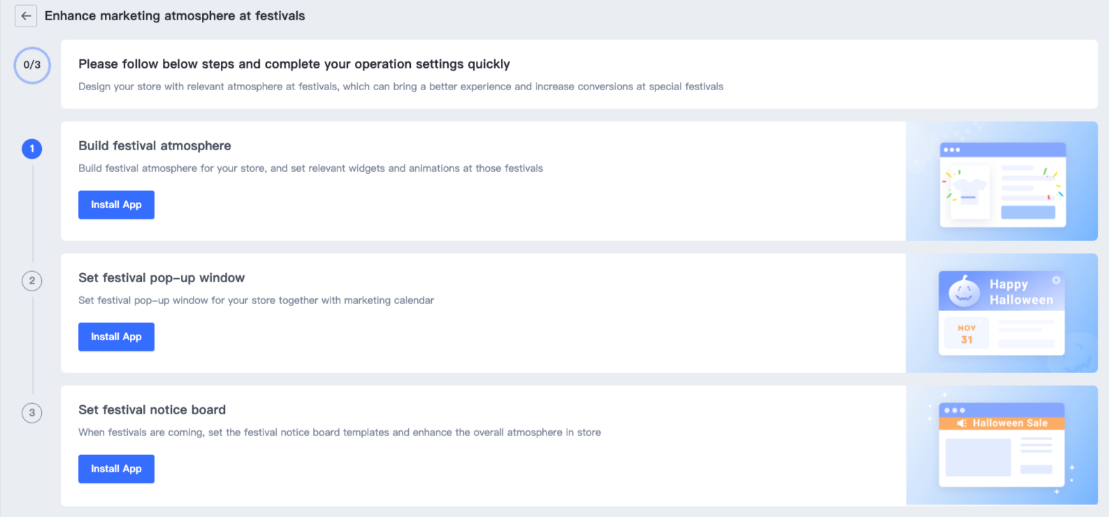 Bạn có thể nhấp trực tiếp vào Bắt đầu để thiết lập lịch marketing, cửa sổ pop-up lễ hội và bảng thông báo lễ hội, giúp bạn tăng cường bầu không khí trong kỳ nghỉ và tăng tỷ lệ chuyển đổi.