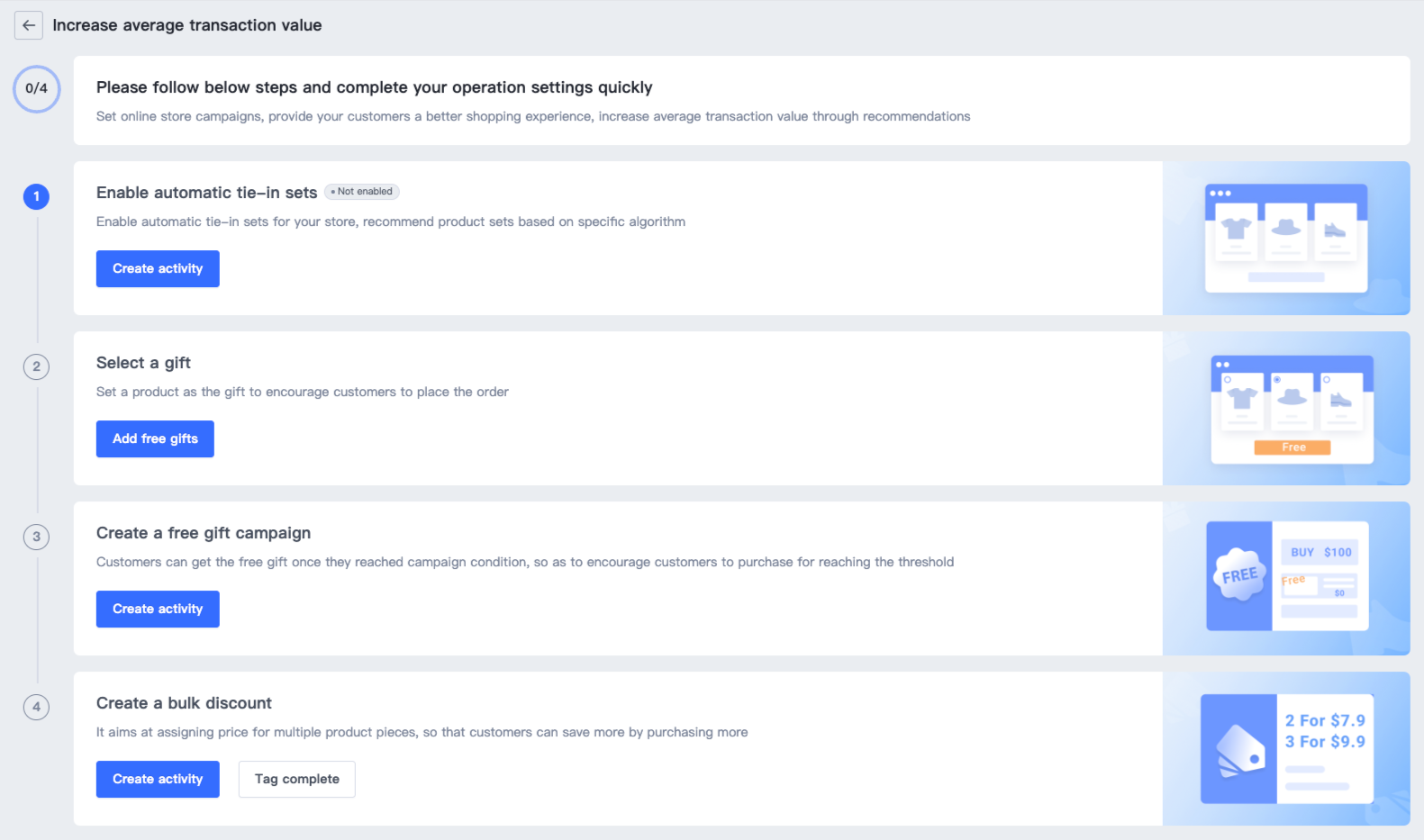 - Giải pháp này giúp bạn thiết lập các chiến dịch tăng giá trị giao dịch trung bình trong cửa hàng qua bốn bước, đó là, kích hoạt tự động kết hợp, chọn quà tặng, tạo các chiến dịch quà tặng miễn phí và thiết lập giảm giá số lượng lớn.