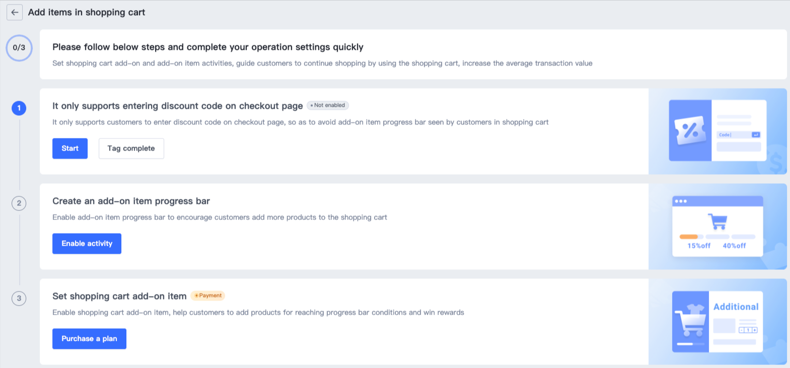 - Trước khi kích hoạt thanh tiến độ sản phẩm bổ sung, bạn có thể vô hiệu hóa các cài đặt nhập mã giảm giá trong giỏ hàng và chỉ hỗ trợ khách hàng nhập mã trên trang thanh toán. Để biết chi tiết về cài đặt, bạn có thể tham khảo Giảm giá Giỏ hàng - Thanh tiến độ.