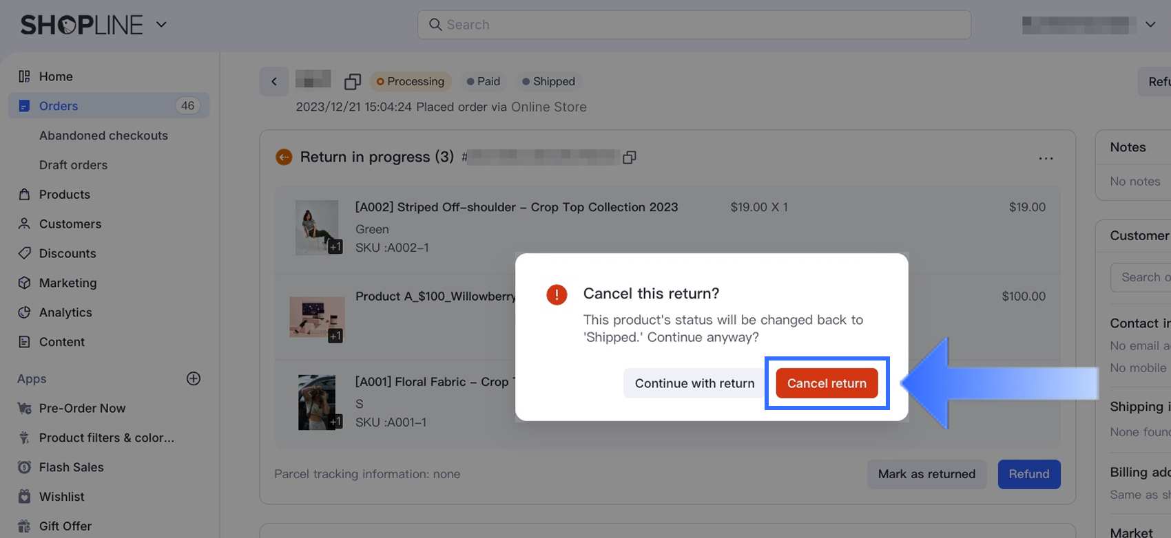 SHOPLINE hỗ trợ trả lại sản phẩm đã hoàn thành và hoàn tiền cho sản phẩm đã thanh toán. Ví dụ, khách hàng có thể yêu cầu trả lại sản phẩm không hài lòng. Hiện tại, SHOPLINE chỉ hỗ trợ các thương nhân khởi tạo yêu cầu hoàn tiền và trả lại từ bảng điều khiển quản trị, và không hỗ trợ khách hàng khởi tạo yêu cầu trả lại hoặc hoàn tiền.