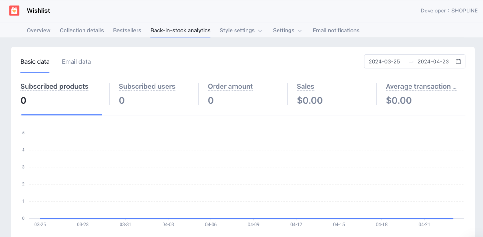 - Bạn có thể kiểm tra số lượng sản phẩm đã đăng ký, số lượng người đăng ký, số lượng đơn hàng chuyển đổi từ thông báo có hàng trở lại, số tiền bán hàng chuyển đổi từ thông báo có hàng trở lại, và ATV của các đơn hàng chuyển đổi từ thông báo có hàng trở lại trong một khoảng thời gian nhất định.