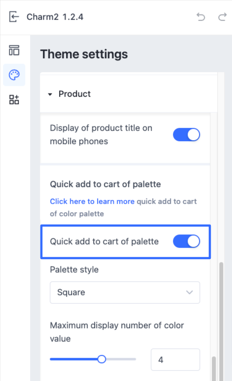 - Số lượng màu tối đa hiển thị: 1-6 (các màu vượt quá số lượng hiển thị tối đa sẽ hiển thị +N, trong đó N bằng số lượng giá trị màu sản phẩm trừ đi số lượng hiển thị tối đa).