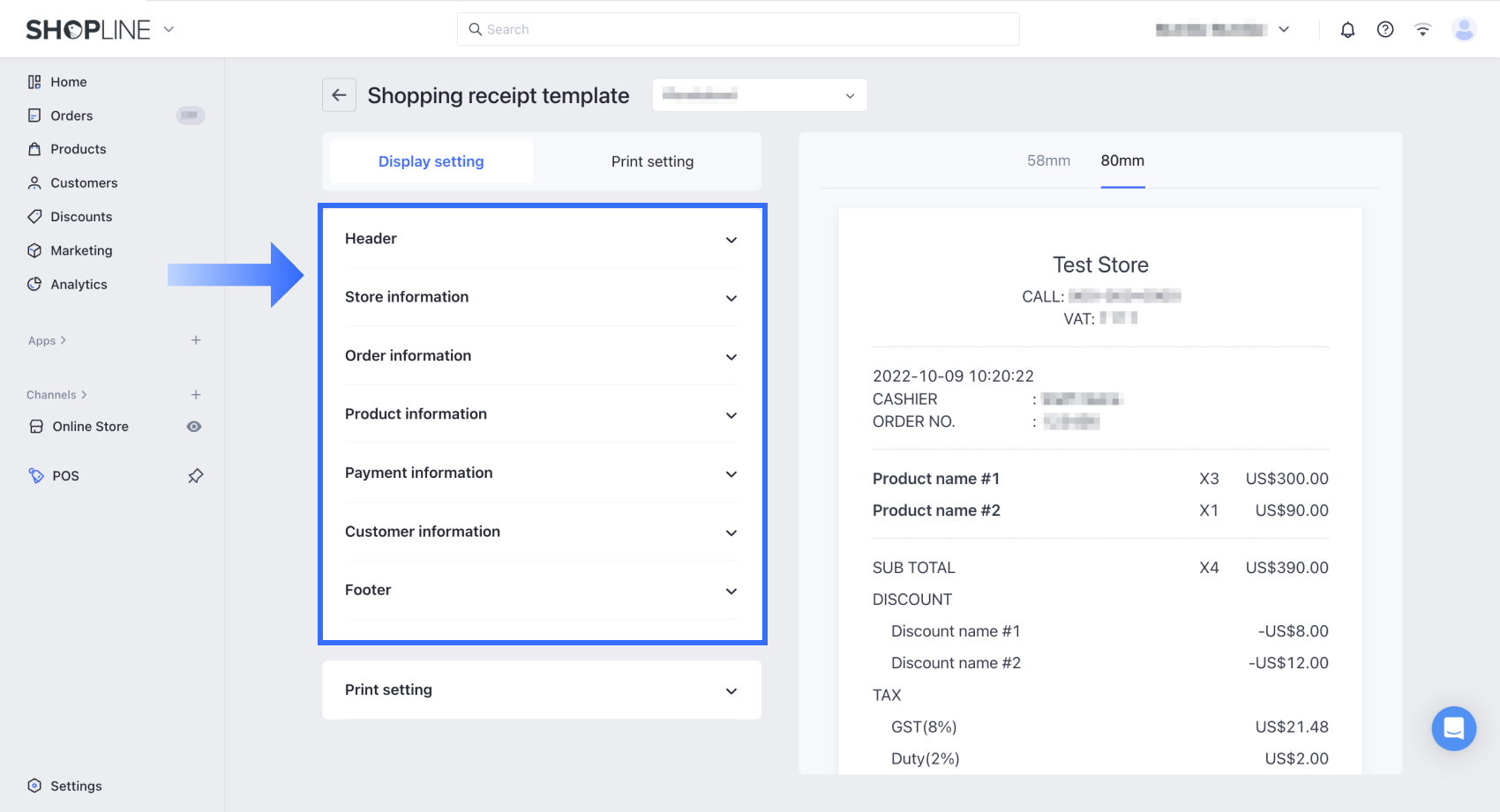 - Từ bảng điều khiển quản trị SHOPLINE của bạn, đi đến Channels > POS > Settings > Receipts.