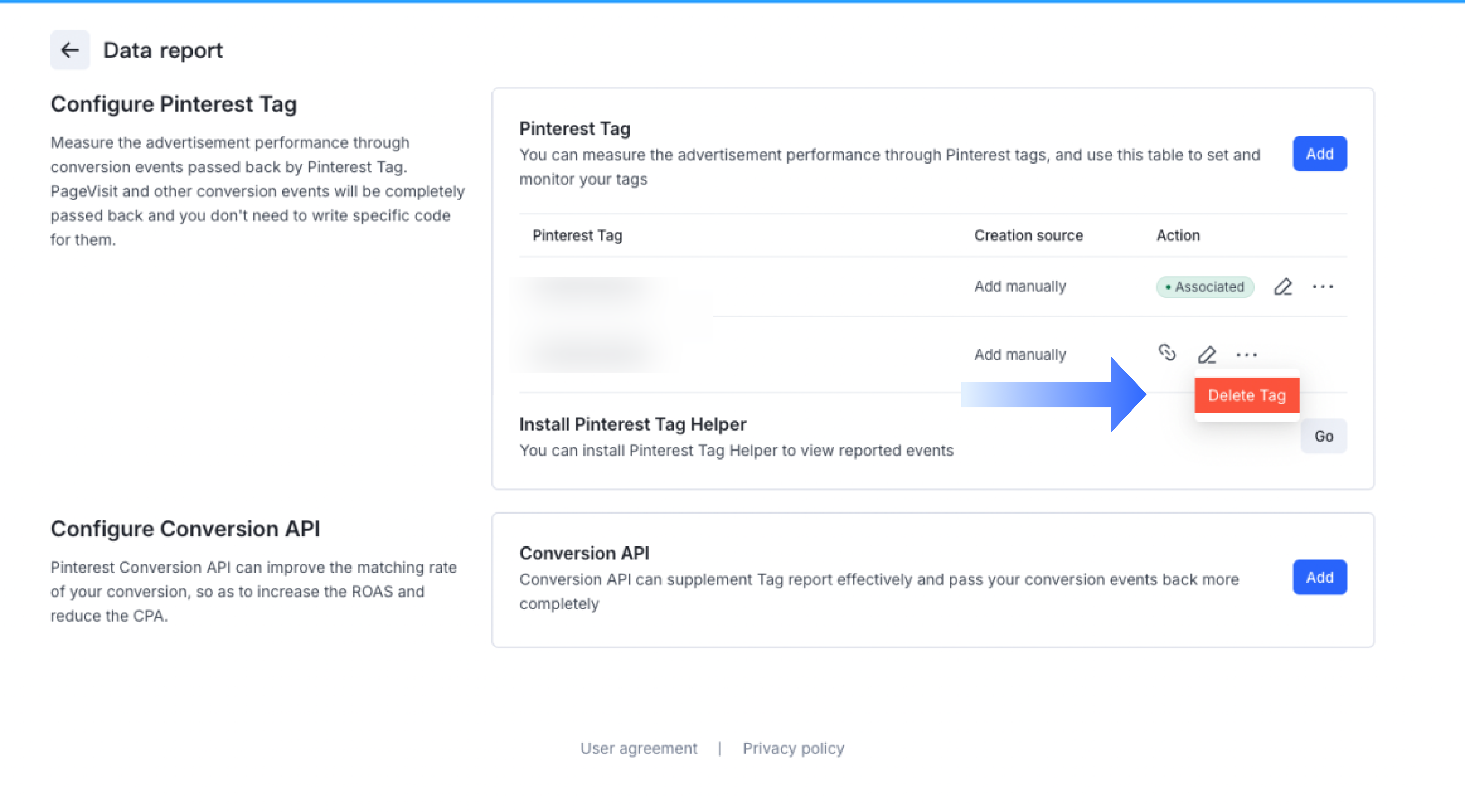 Nếu bạn không còn cần Pinterest Tag, bạn có thể dễ dàng xóa nó khỏi backend của SHOPLINE:
