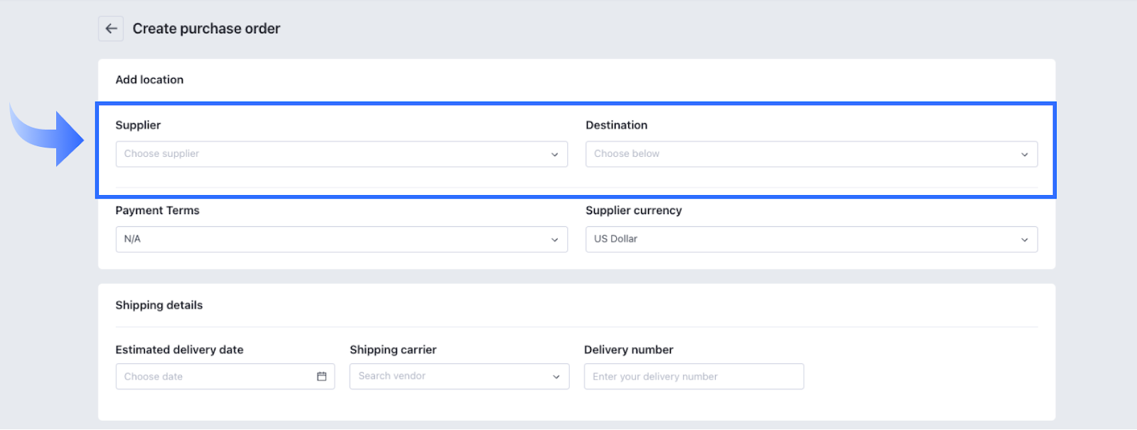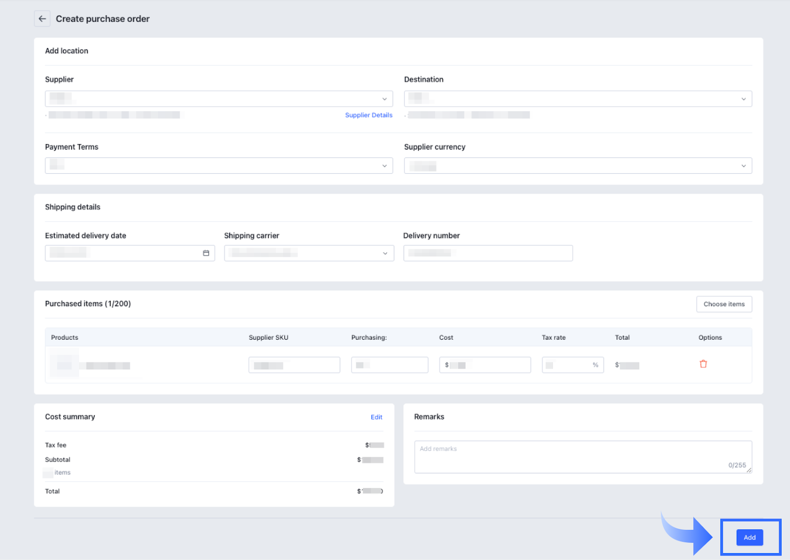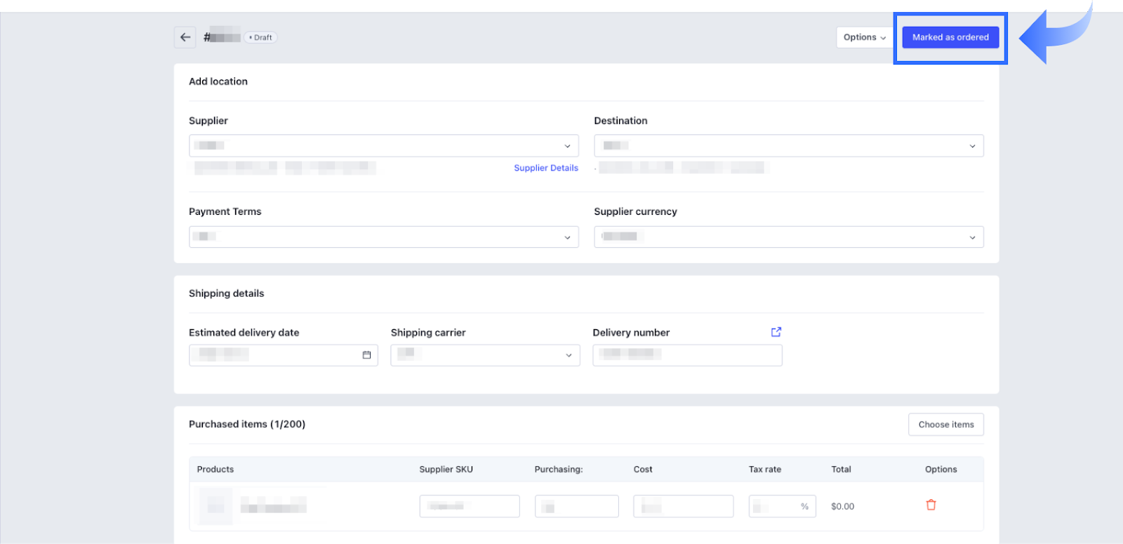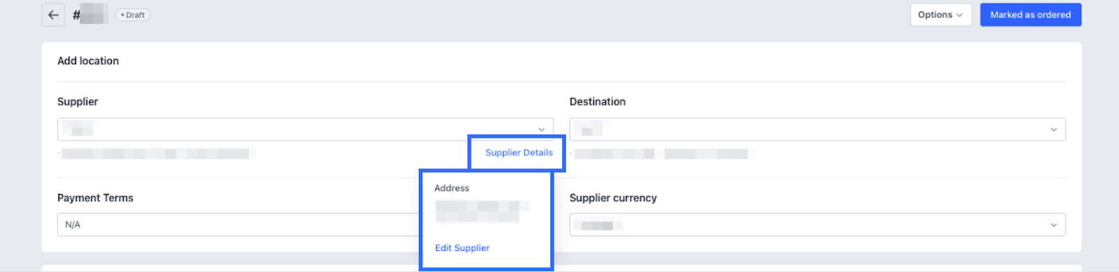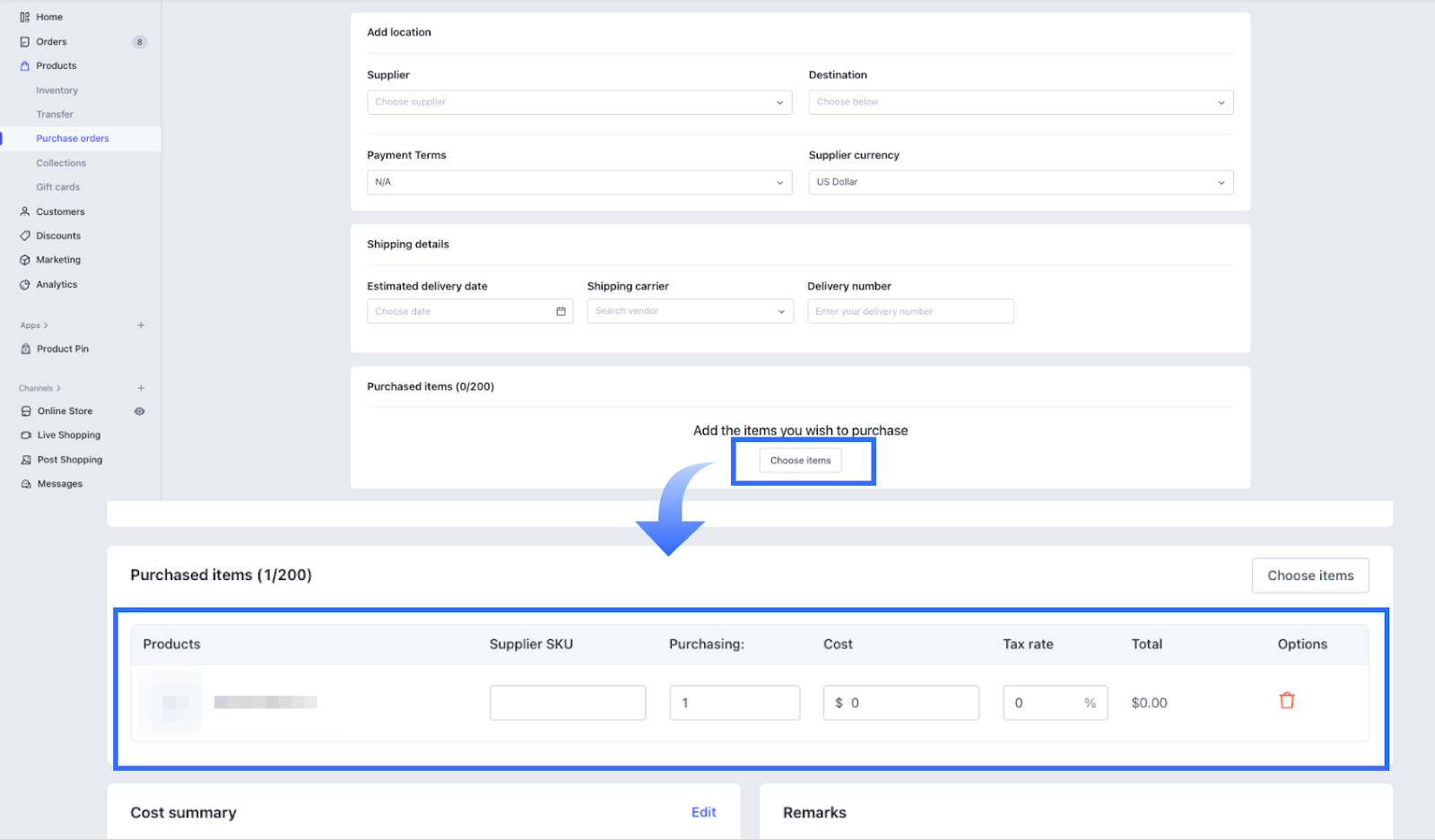 Khi bạn điền thông tin cho một đơn đặt hàng, SHOPLINE tự động ghi lại thông tin liên quan về các sản phẩm được mua từ nhà cung cấp, bao gồm chi tiết sản phẩm, thông tin nhà cung cấp, SKU của nhà cung cấp, chi phí, tỷ lệ, tiền tệ, v.v. Lần tiếp theo bạn mua cùng một sản phẩm từ cùng một nhà cung cấp, SHOPLINE sẽ tự động thêm thông tin này cho bạn.