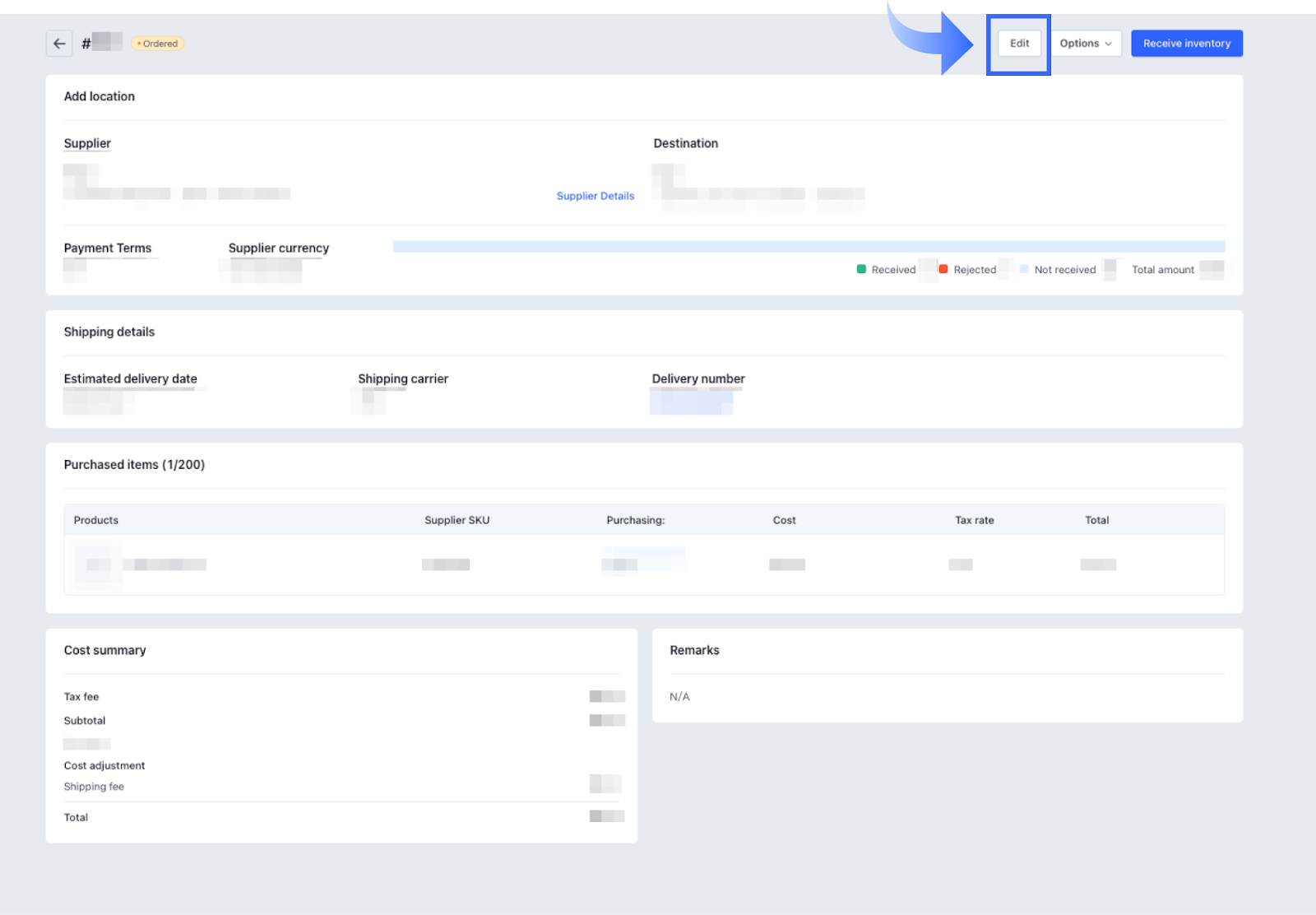 Nếu đơn đặt hàng đã được đánh dấu là Đã đặt hàng, hoặc nếu một số/tất cả hàng tồn kho đã được chấp nhận, bạn có thể nhấp vào nút Chỉnh sửa ở góc trên bên phải để thực hiện các điều chỉnh.