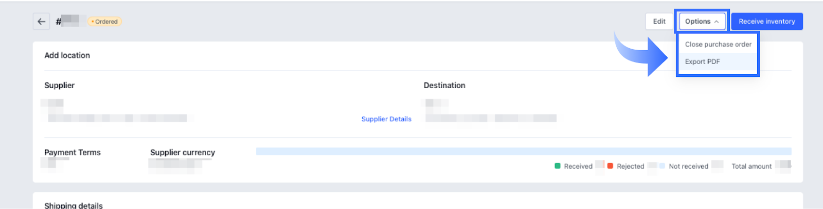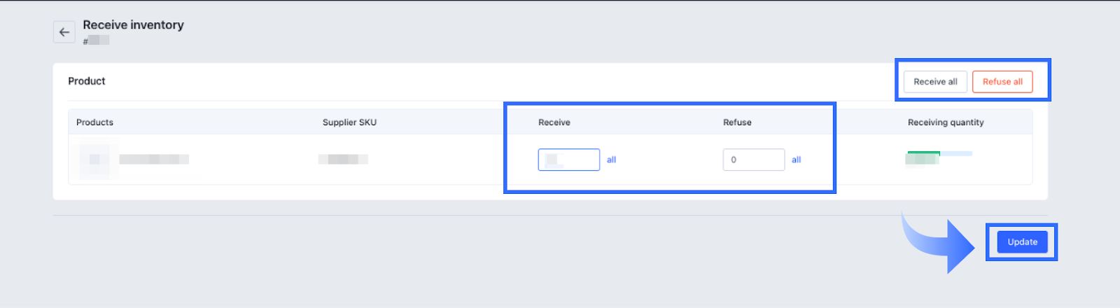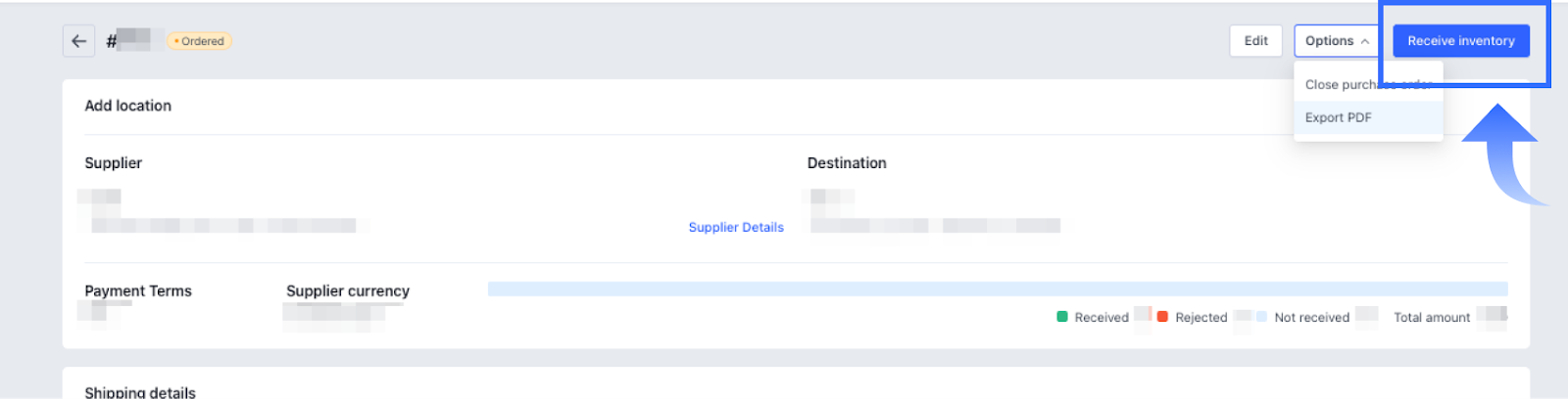 Khi bạn nhận sản phẩm đã mua từ nhà cung cấp, bạn có thể ghi lại số lượng đã nhận trong quản trị SHOPLINE. Số lượng đã nhận sẽ tự động được thêm vào hàng tồn kho có sẵn của sản phẩm, và hàng tồn kho đến sẽ giảm tương ứng.