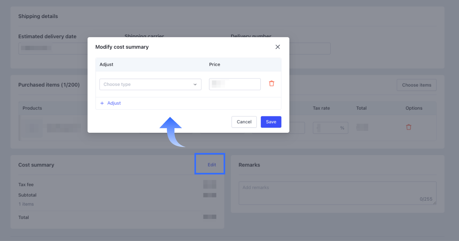 Bạn có thể thêm các chi phí phát sinh khác bằng cách nhấp vào nút Chỉnh sửa trong phần Tóm tắt Chi phí để chọn hoặc nhập các chi tiết điều chỉnh chi phí mà bạn cần.