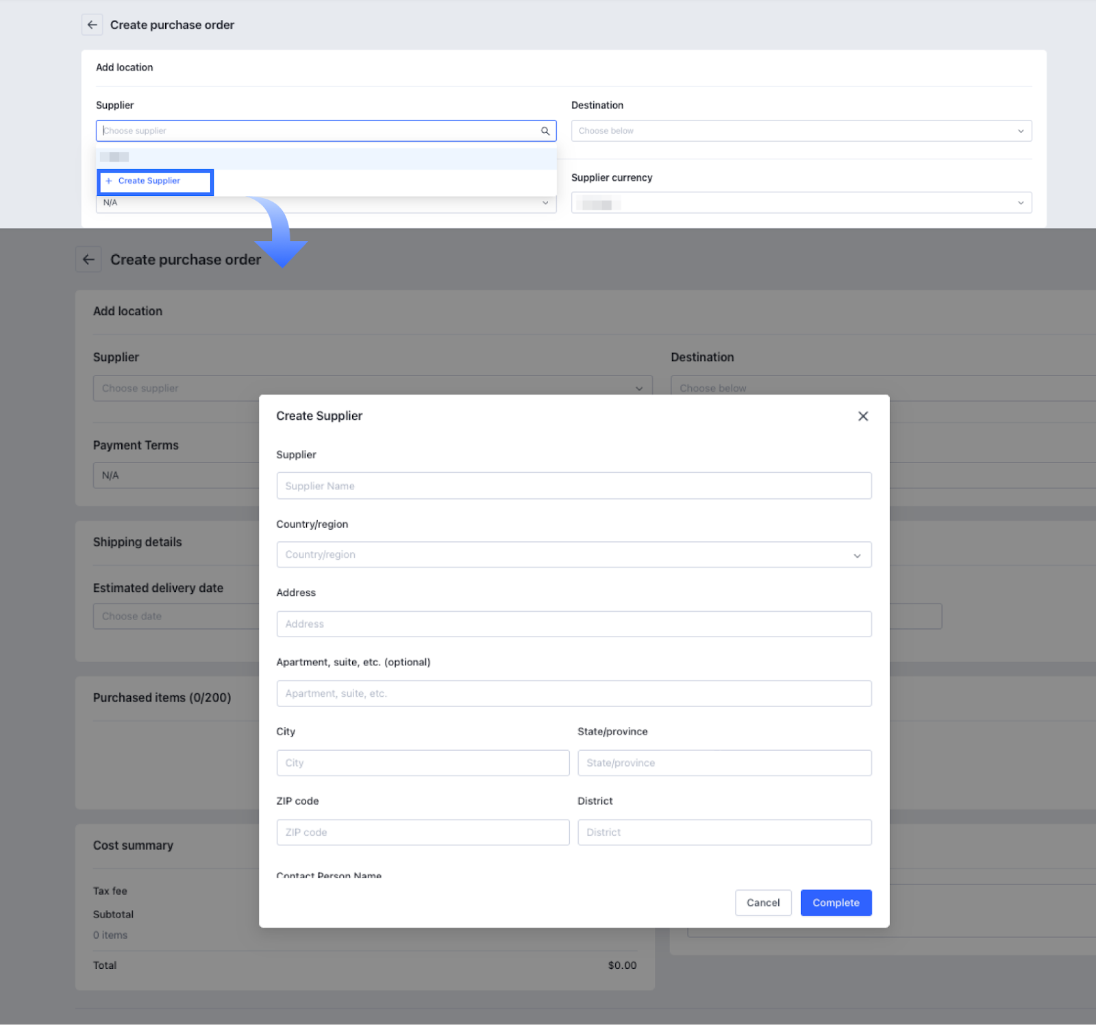 Nếu bạn cần thêm một nhà cung cấp mới, bạn có thể nhấp vào Tạo Nhà Cung Cấp trong menu thả xuống nhà cung cấp trên giao diện đơn đặt hàng. Điền các thông tin liên quan trong cửa sổ pop-up và nhấp vào Hoàn tất. Nhà cung cấp mới được thêm sẽ được liệt kê trong menu thả xuống.