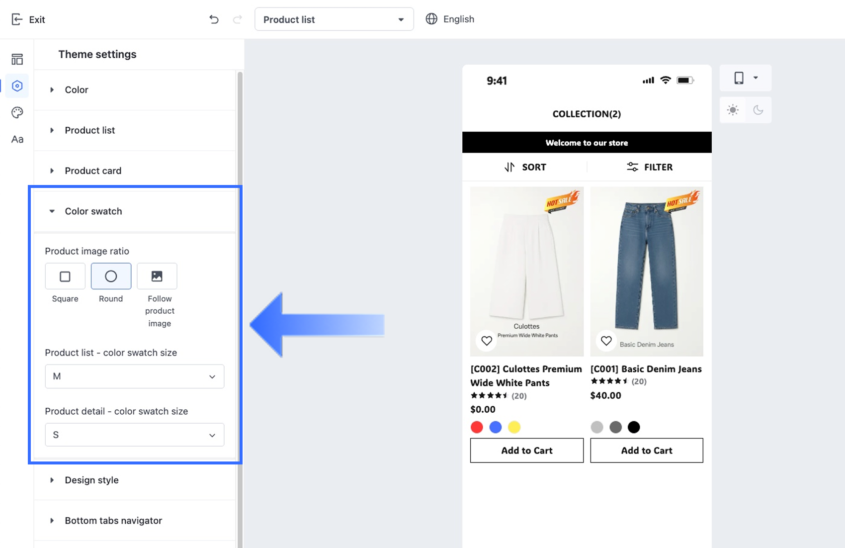 - Danh sách sản phẩm – kích thước mẫu màu: Chọn kích thước của mẫu màu được hiển thị trên các trang liên quan đến danh sách sản phẩm, chẳng hạn như bộ sưu tập và kết quả tìm kiếm. Bạn có thể chọn từ các kích thước có sẵn (S, M, L) để thiết lập nhanh, hoặc chọn Tùy chỉnh để định nghĩa kích thước phù hợp hơn với nhu cầu thiết kế của bạn.