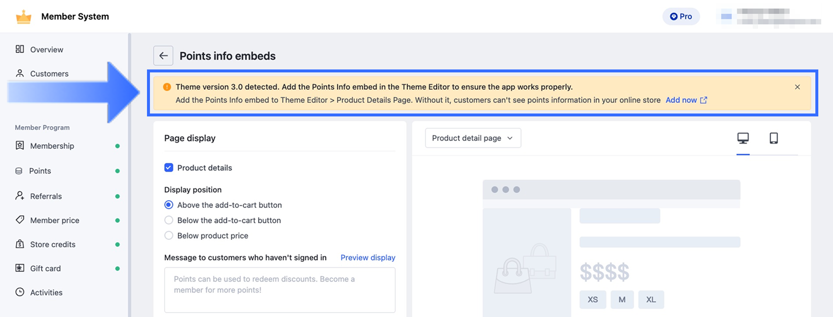 Lưu ý: Nếu bạn đang sử dụng giao diện SHOPLINE OS 3.0, bạn phải thêm thủ công khối ứng dụng Nhúng Thông tin Điểm vào trang Sản phẩm trong trình chỉnh sửa giao diện để hiển thị đúng banner chiến dịch và các cài đặt liên quan trên cửa hàng. Để biết chi tiết về chức năng khối ứng dụng, các bước thiết lập và các tính năng ứng dụng yêu cầu hỗ trợ khối ứng dụng, hãy tham khảo bài viết Trung tâm Trợ giúp "Tích hợp Ứng dụng vào Giao diện OS 3.0". |
