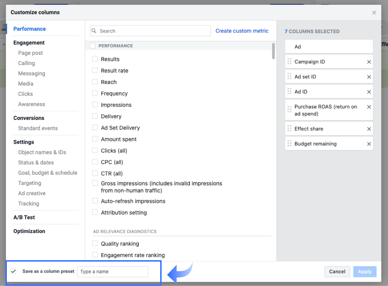 | Ghi chú: Bạn có thể nhấp để chọn bất kỳ mục nào mà bạn muốn xem cho mỗi quảng cáo. Các mục tùy chỉnh chỉ có thể được chọn theo quảng cáo, không hỗ trợ chọn cho tất cả quảng cáo. |
