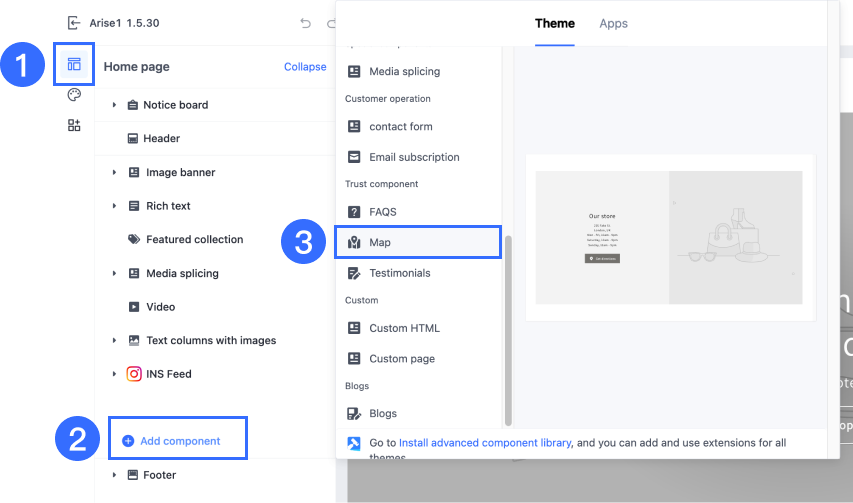 - Đi đến tab Thành phần > nhấp vào +Thêm thành phần > chọn Bản đồ trong phần thành phần Tin cậy.