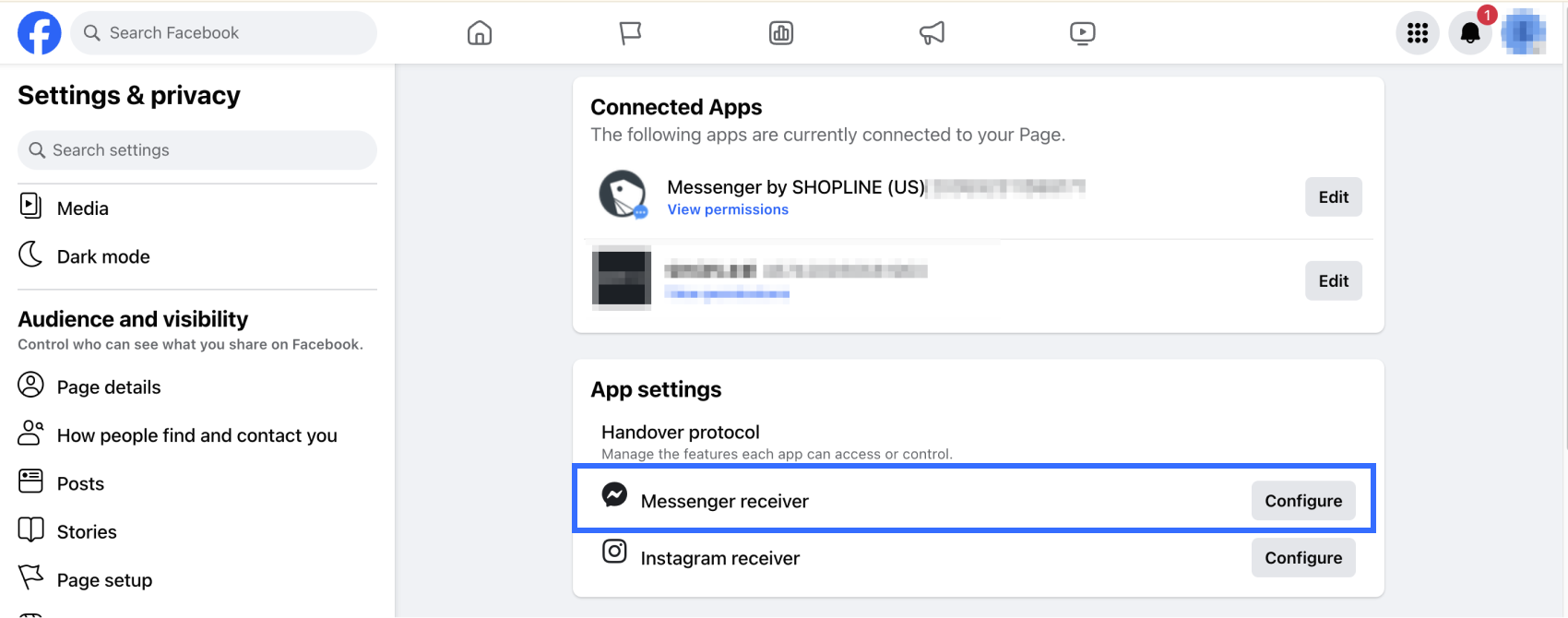 - Đi đến Cài đặt ứng dụng và nhấp vào Người nhận Messenger > Cấu hình.