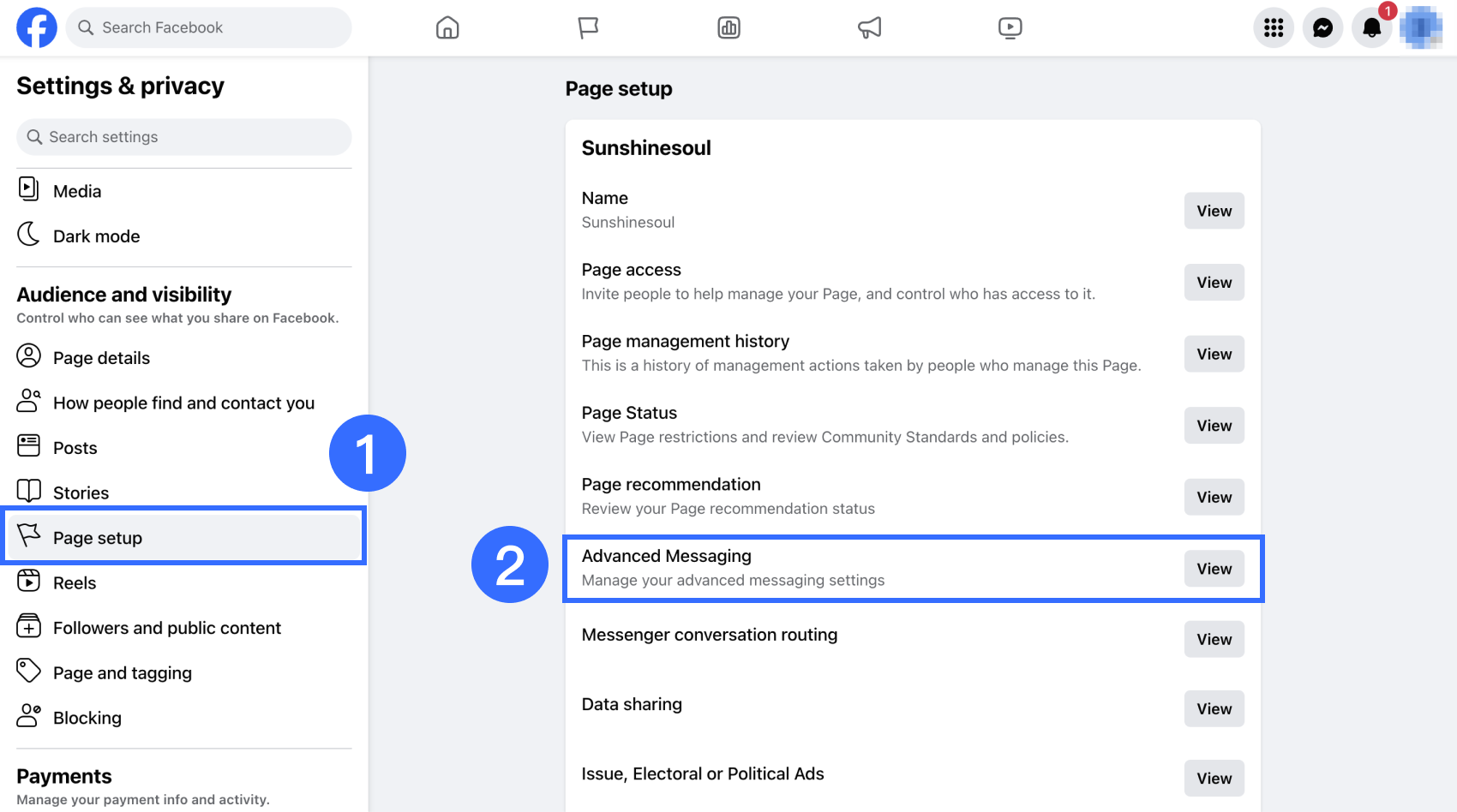 - Nếu đã hơn 7 ngày, hãy đăng nhập vào tài khoản Facebook của bạn. Nhấp vào mũi tên ở góc trên bên phải của trang và điều hướng đến Cài đặt & quyền riêng tư > Cài đặt > Cài đặt trang > Tin nhắn nâng cao > Xem. Đánh dấu vào ô bên cạnh Messenger của SHOPLINE và nhấp vào Xóa. Quay lại quản trị SHOPLINE và cố gắng kết nối trang của bạn một lần nữa.