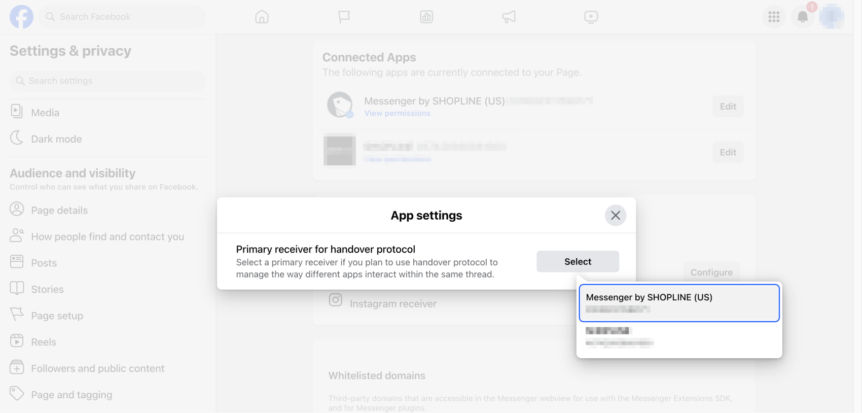 Nếu SHOPLINE không được đặt làm ứng dụng chính của bạn trong Facebook, một thông báo lỗi sẽ xuất hiện. Theo hướng dẫn, hãy cấu hình SHOPLINE làm người nhận chính.