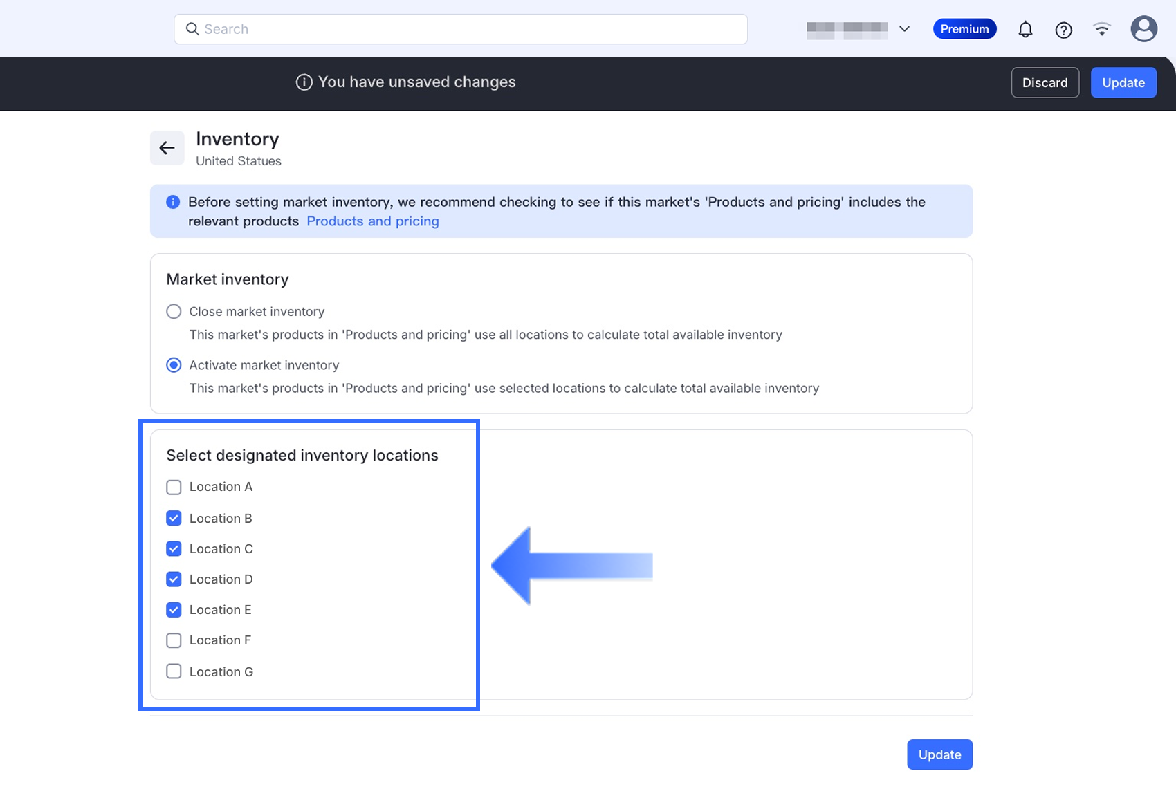 Nếu bạn chọn Kích hoạt kho hàng thị trường, cuộn xuống phần Chọn địa điểm kho hàng chỉ định, sau đó chọn các địa điểm bạn muốn thị trường này sử dụng để thực hiện đơn hàng kho hàng.