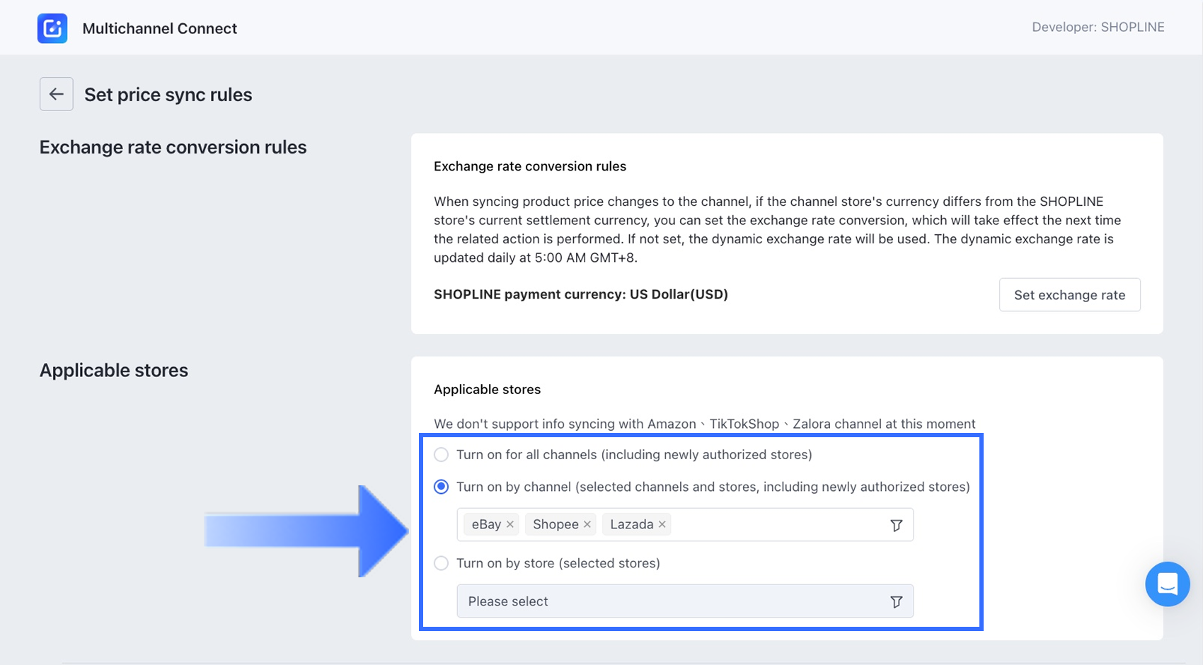 Cửa hàng áp dụng: Chọn để kích hoạt đồng bộ hóa giá cho tất cả các kênh, các kênh đã chọn, hoặc các cửa hàng đã chọn.