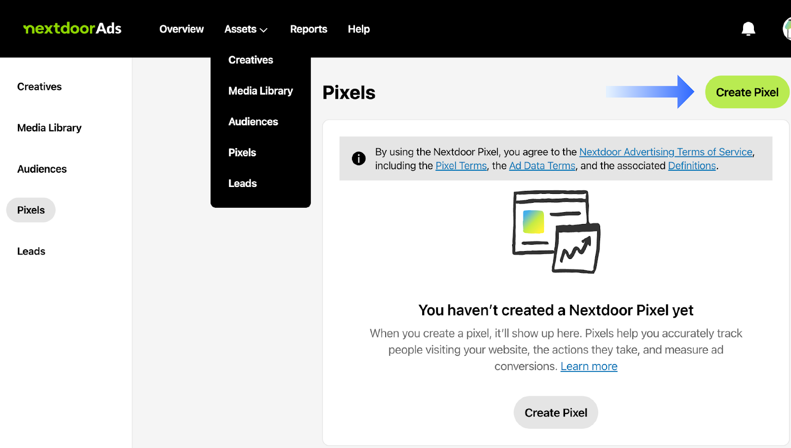 - Đăng nhập vào Trình quản lý quảng cáo Nextdoor. Đi đến Tài sản > Pixel và nhấp vào Tạo Pixel.