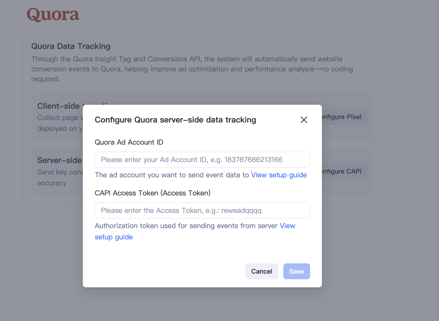 - Quay lại bảng điều khiển SHOPLINE Admin > Kênh Quora > Báo cáo phía máy chủ > Cấu hình CAPI, nhập cả hai:
