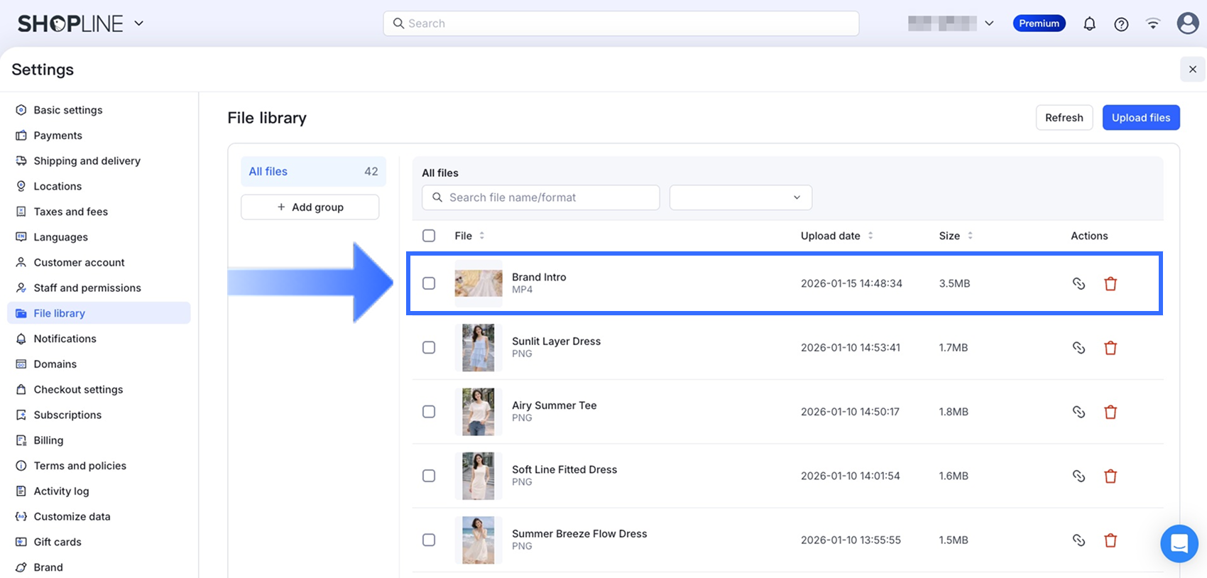 - Từ bảng quản trị SHOPLINE của bạn, vào Cài đặt > Thư viện tệp.