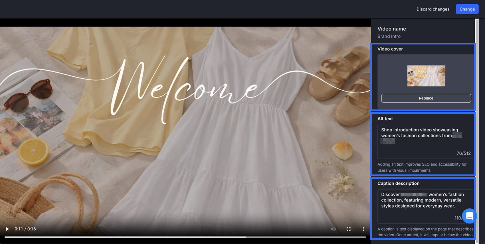 Ngay cả khi Văn bản thay thế hoặc Mô tả chú thích được cấu hình cho video trong Thư viện tệp, các thiết lập này sẽ không có hiệu lực khi video được thêm vào trang sản phẩm.