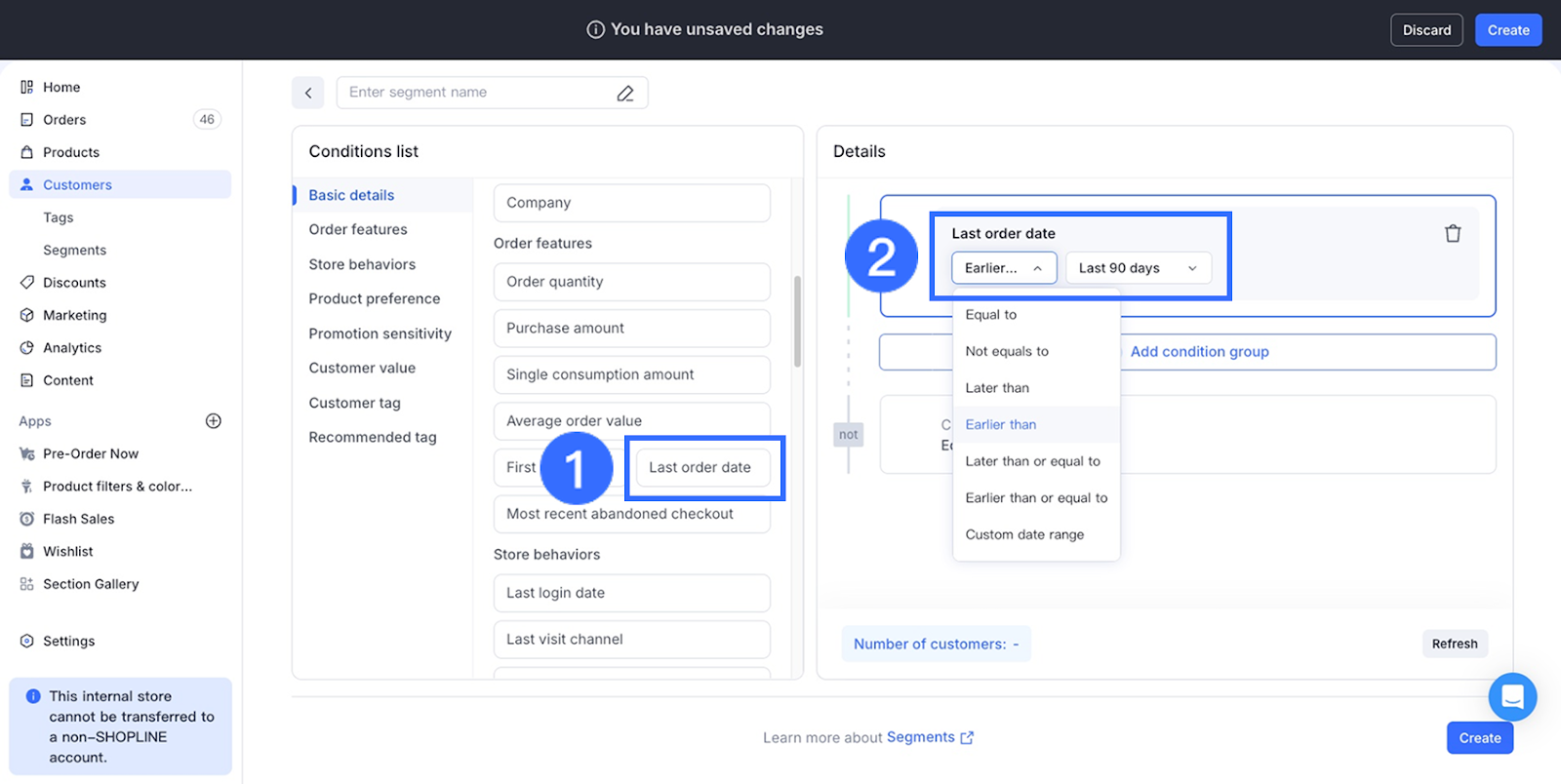 Ví dụ, một điều kiện như "Ngày đặt hàng cuối cùng" là "trước 90 ngày gần đây" cho phép bạn liên tục nhắm mục tiêu khách hàng không hoạt động. Những điều kiện cuộn này hỗ trợ phân khúc dựa trên vòng đời cho các chiến dịch tái kích hoạt và giữ chân khách hàng luôn hoạt động.