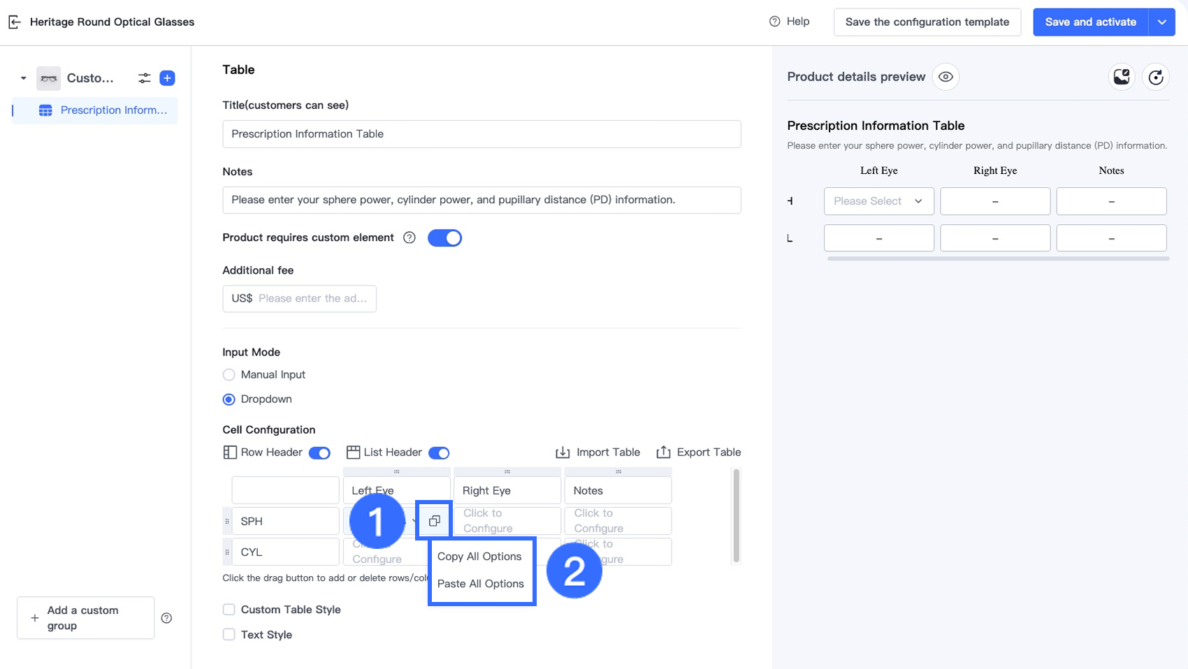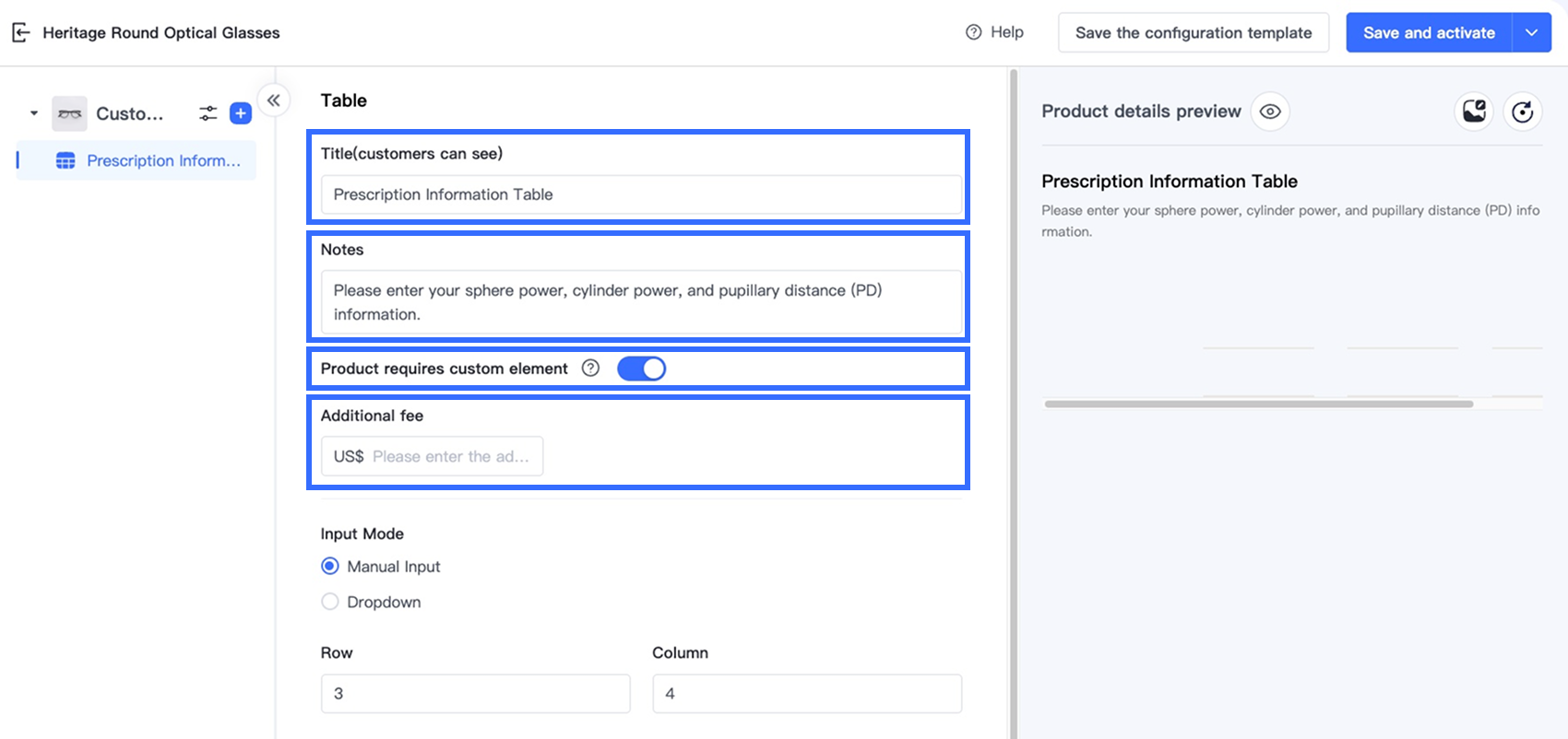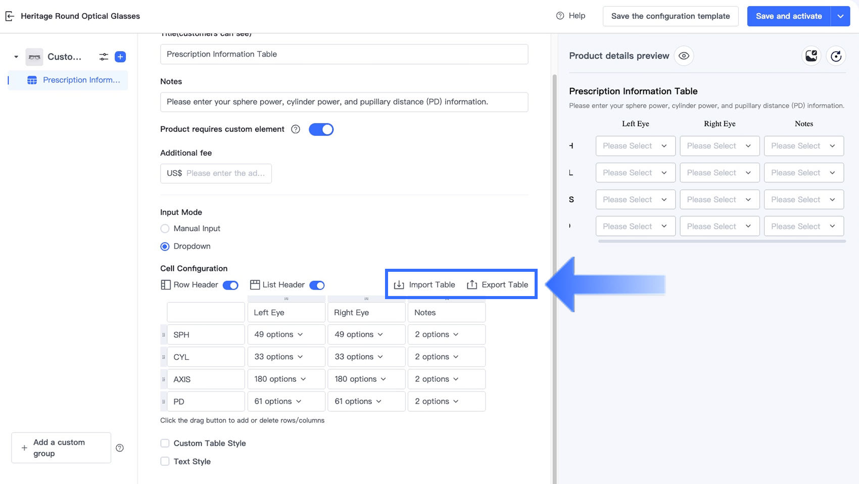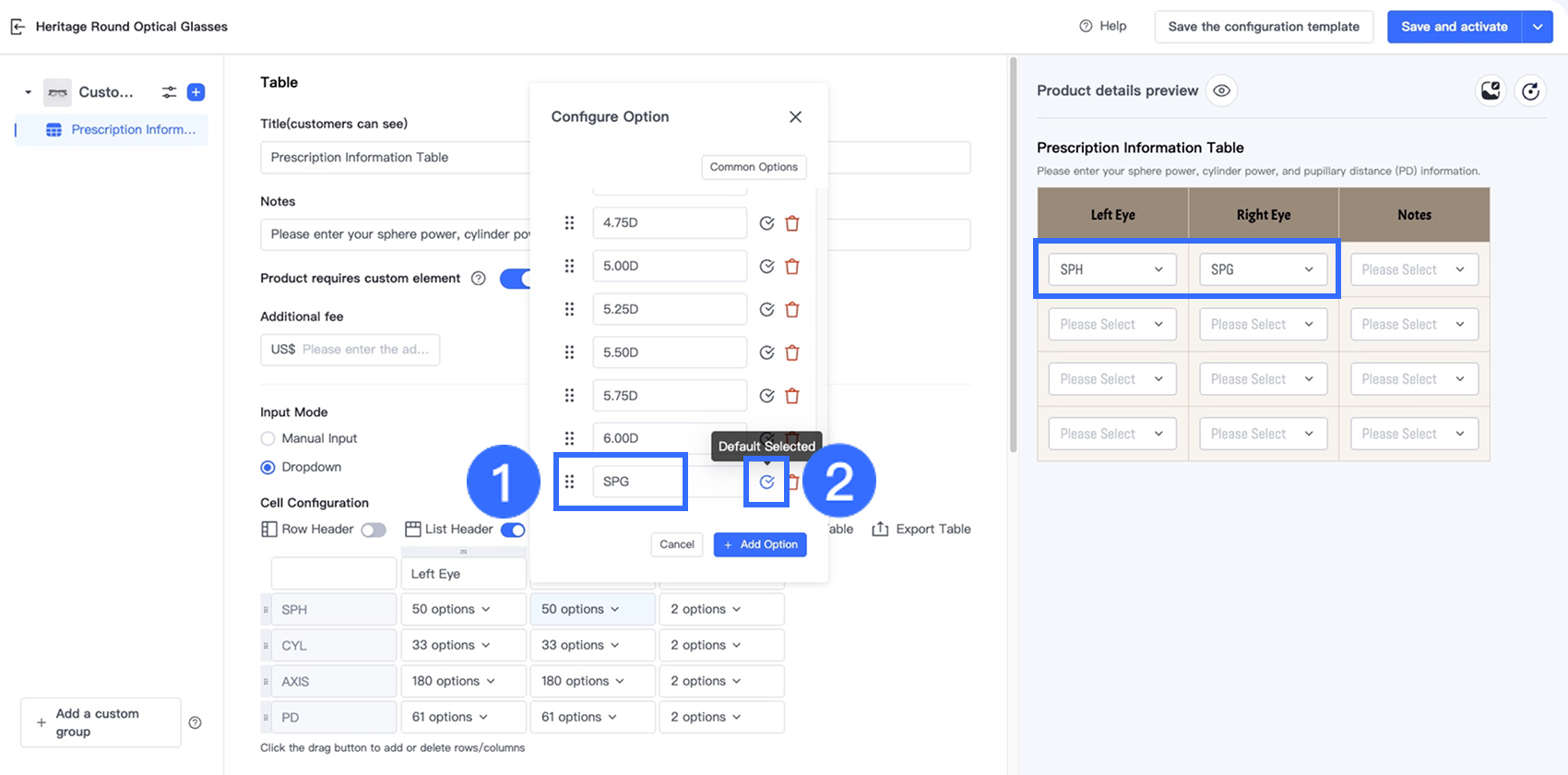 Tùy chọn Bảng trong Trình thiết kế tùy chọn cho phép người bán thu thập thông tin tùy chỉnh có cấu trúc, nhiều trường trực tiếp trên trang sản phẩm. Tùy chọn này lý tưởng cho các ngành yêu cầu khách hàng nhập nhiều giá trị liên quan trong một định dạng rõ ràng, dựa trên lưới — chẳng hạn như đơn thuốc kính mắt, kích thước trang phục tùy chỉnh, quà tặng cá nhân hóa và dịch vụ in ấn.