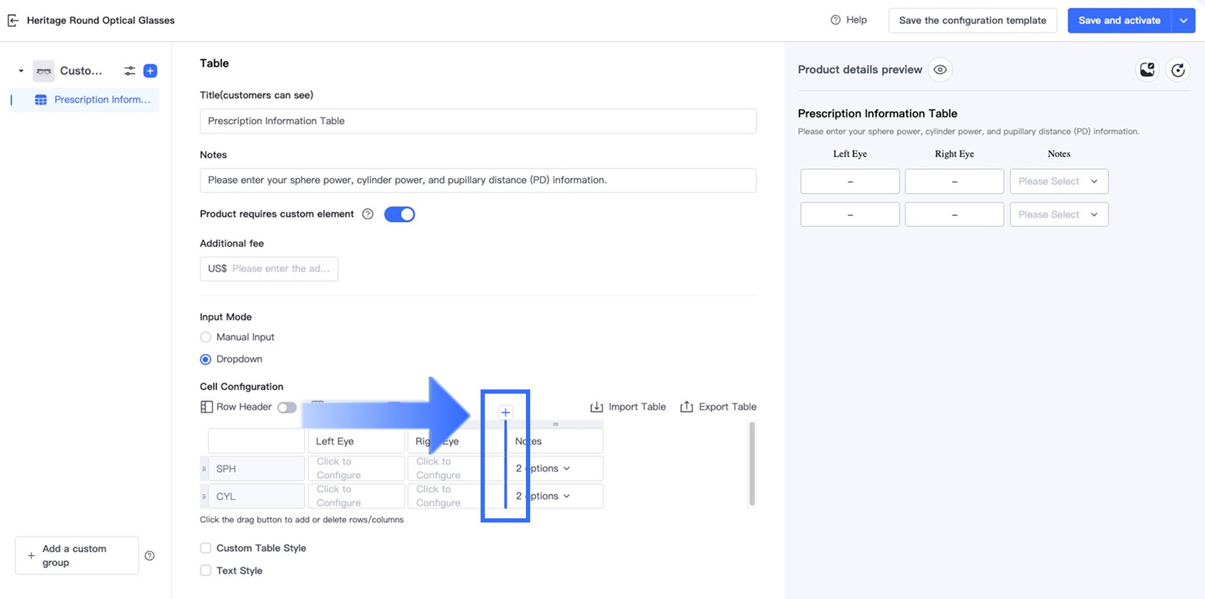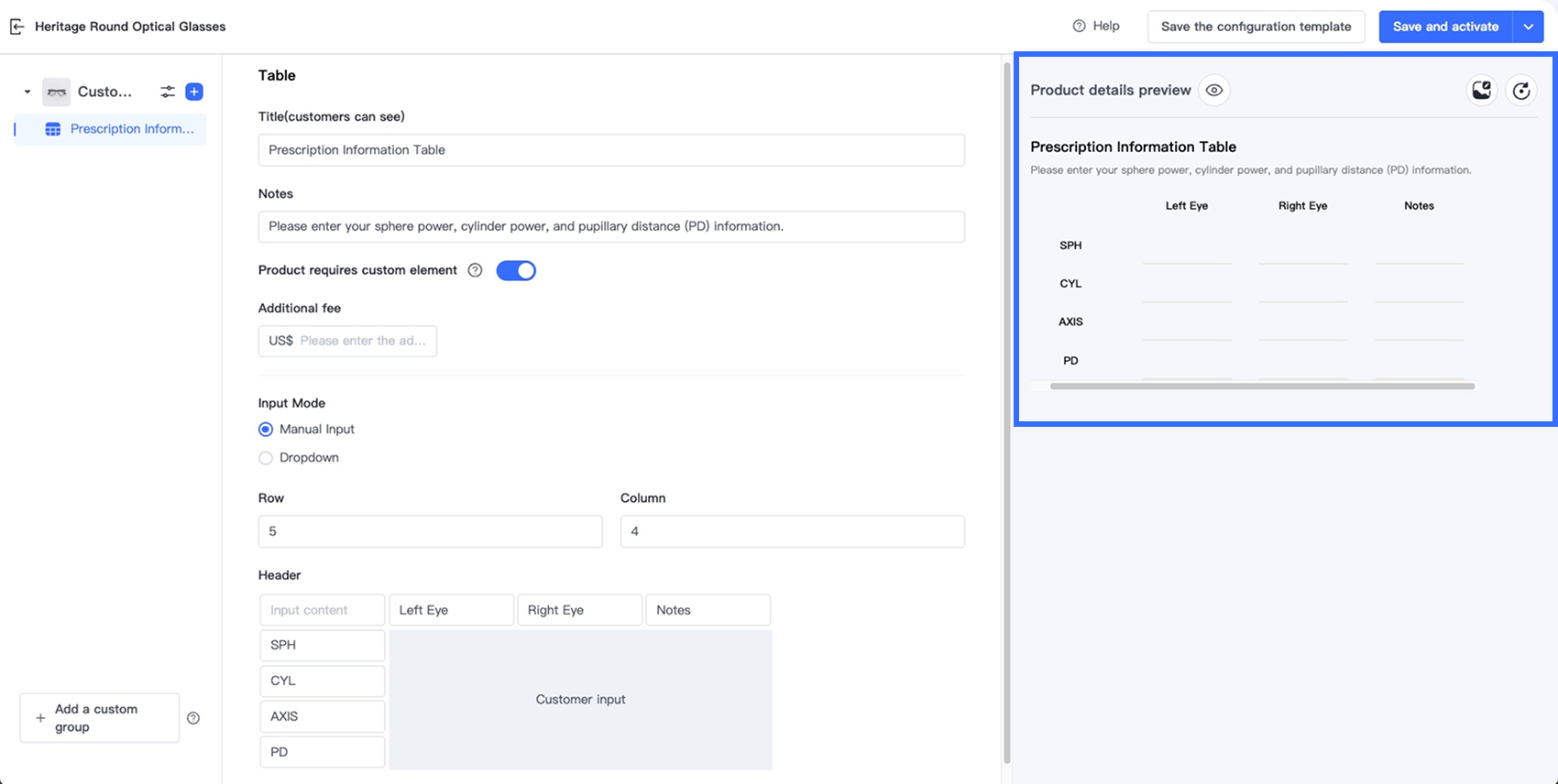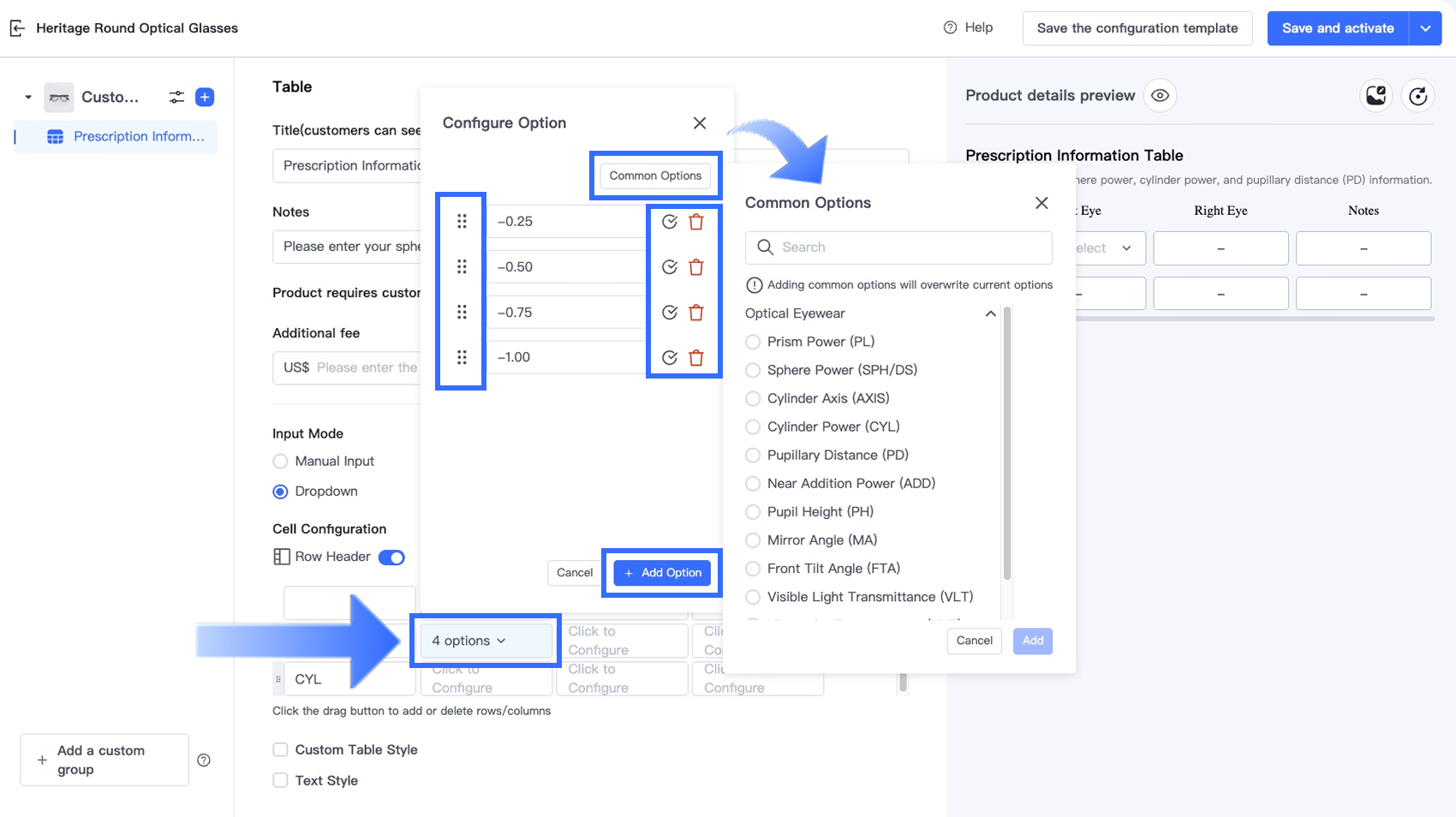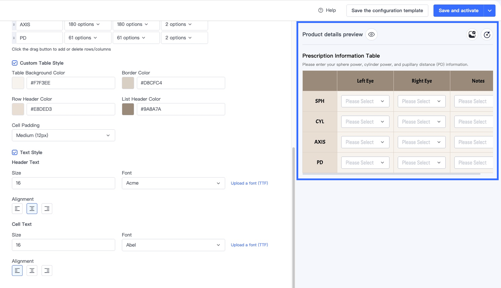 Tùy chọn Bảng trong Trình thiết kế tùy chọn cho phép người bán thu thập thông tin tùy chỉnh có cấu trúc, nhiều trường trực tiếp trên trang sản phẩm. Tùy chọn này lý tưởng cho các ngành yêu cầu khách hàng nhập nhiều giá trị liên quan trong một định dạng rõ ràng, dựa trên lưới — chẳng hạn như đơn thuốc kính mắt, kích thước trang phục tùy chỉnh, quà tặng cá nhân hóa và dịch vụ in ấn.