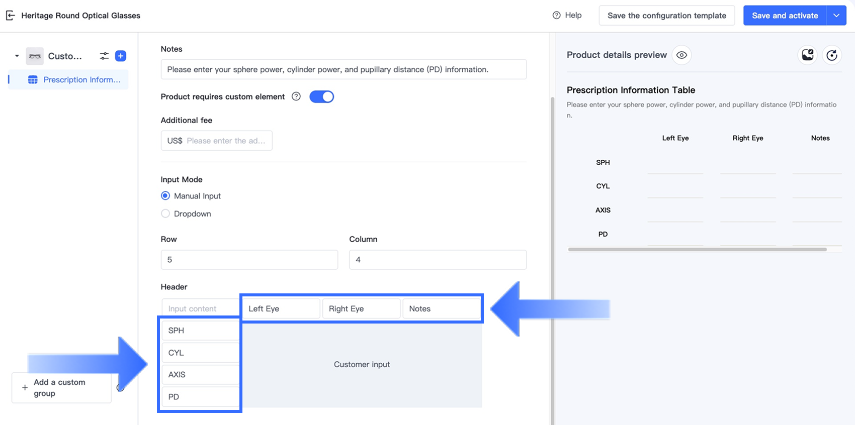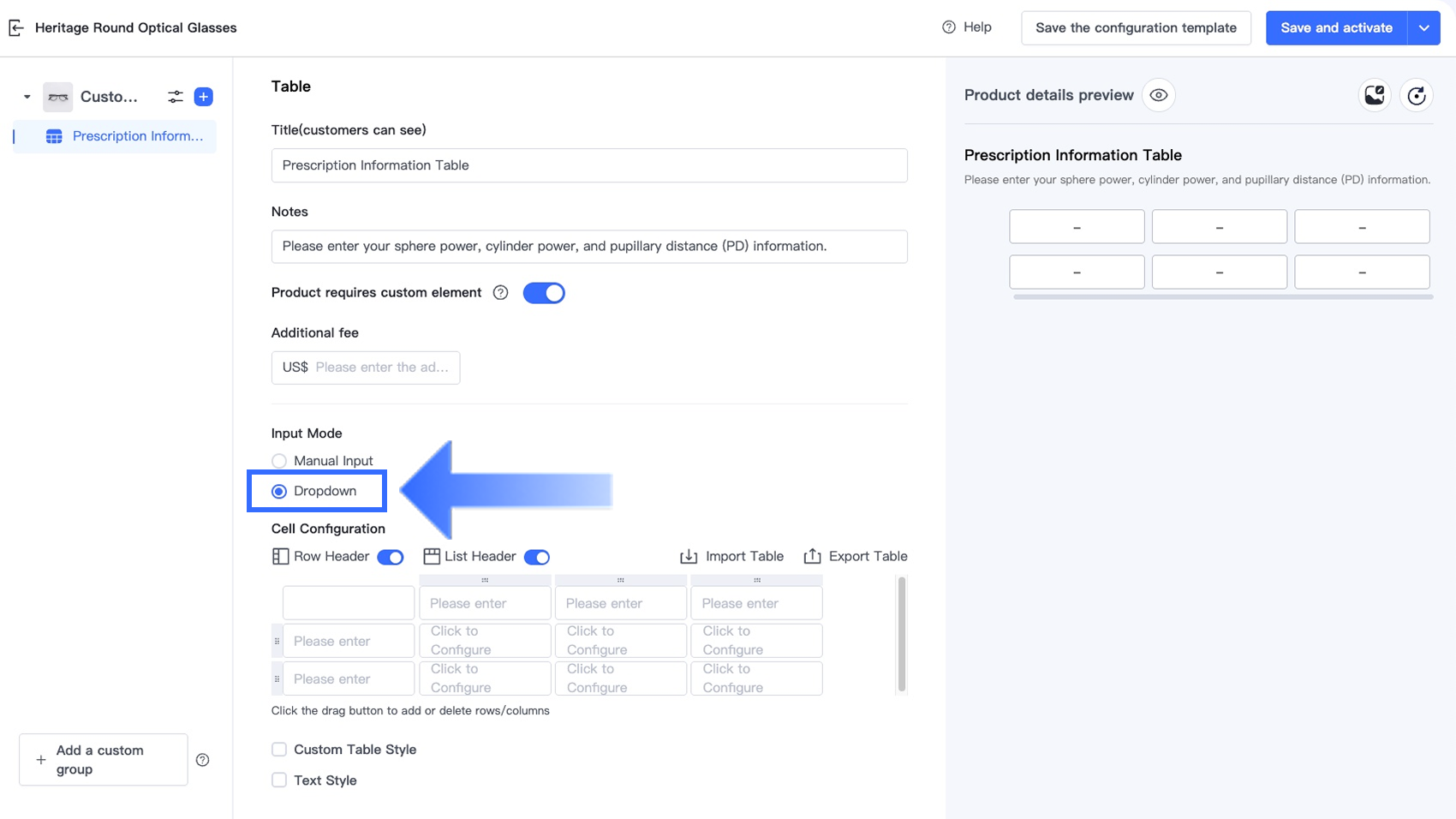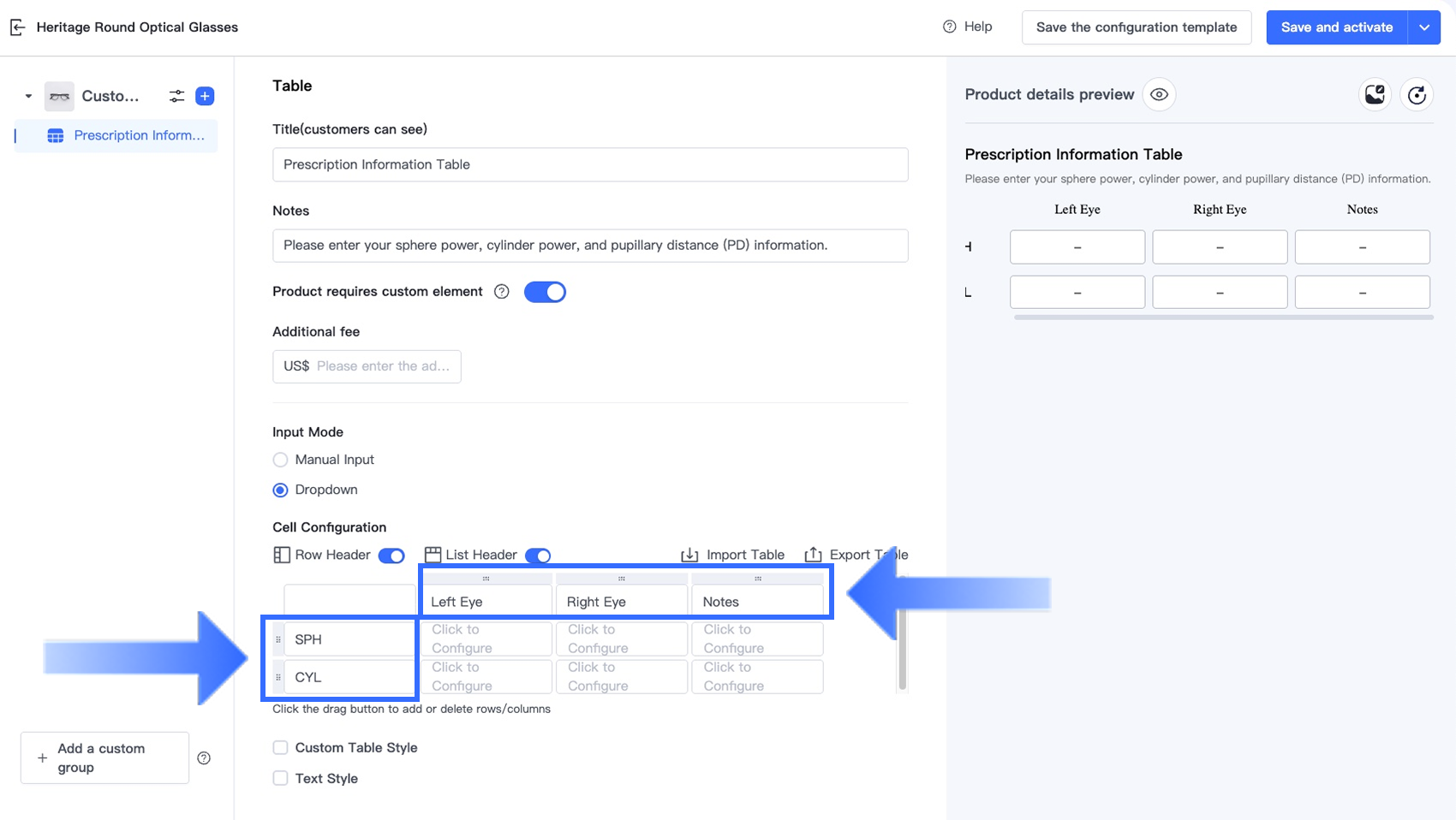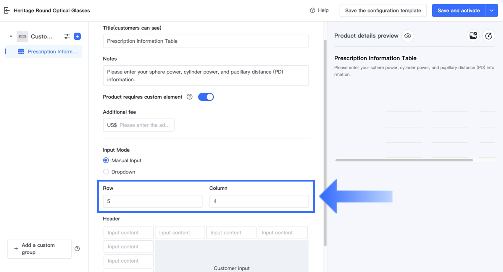 Tùy chọn Bảng trong Trình thiết kế tùy chọn cho phép người bán thu thập thông tin tùy chỉnh có cấu trúc, nhiều trường trực tiếp trên trang sản phẩm. Tùy chọn này lý tưởng cho các ngành yêu cầu khách hàng nhập nhiều giá trị liên quan trong một định dạng rõ ràng, dựa trên lưới — chẳng hạn như đơn thuốc kính mắt, kích thước trang phục tùy chỉnh, quà tặng cá nhân hóa và dịch vụ in ấn.