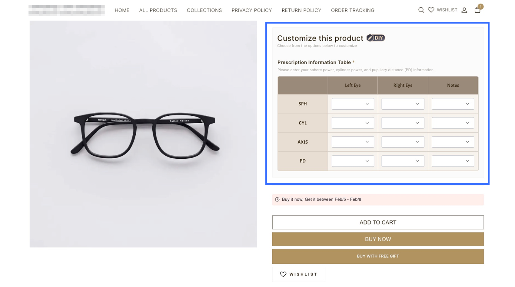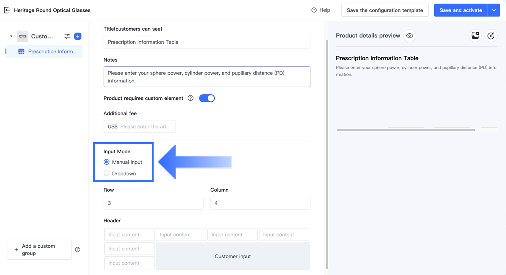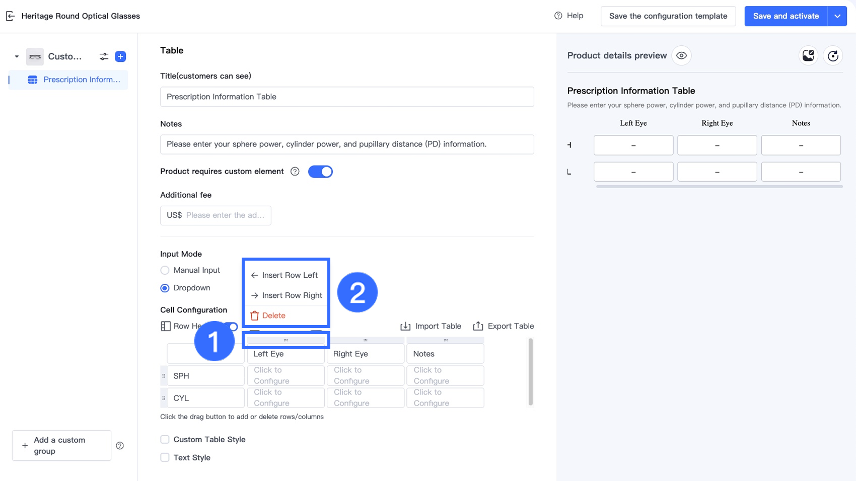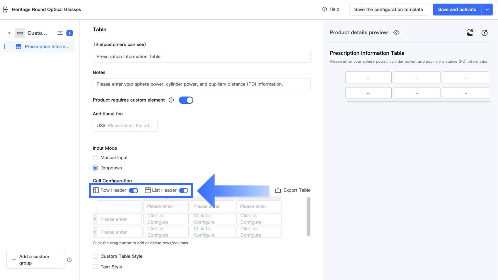 Tùy chọn Bảng trong Trình thiết kế tùy chọn cho phép người bán thu thập thông tin tùy chỉnh có cấu trúc, nhiều trường trực tiếp trên trang sản phẩm. Tùy chọn này lý tưởng cho các ngành yêu cầu khách hàng nhập nhiều giá trị liên quan trong một định dạng rõ ràng, dựa trên lưới — chẳng hạn như đơn thuốc kính mắt, kích thước trang phục tùy chỉnh, quà tặng cá nhân hóa và dịch vụ in ấn.