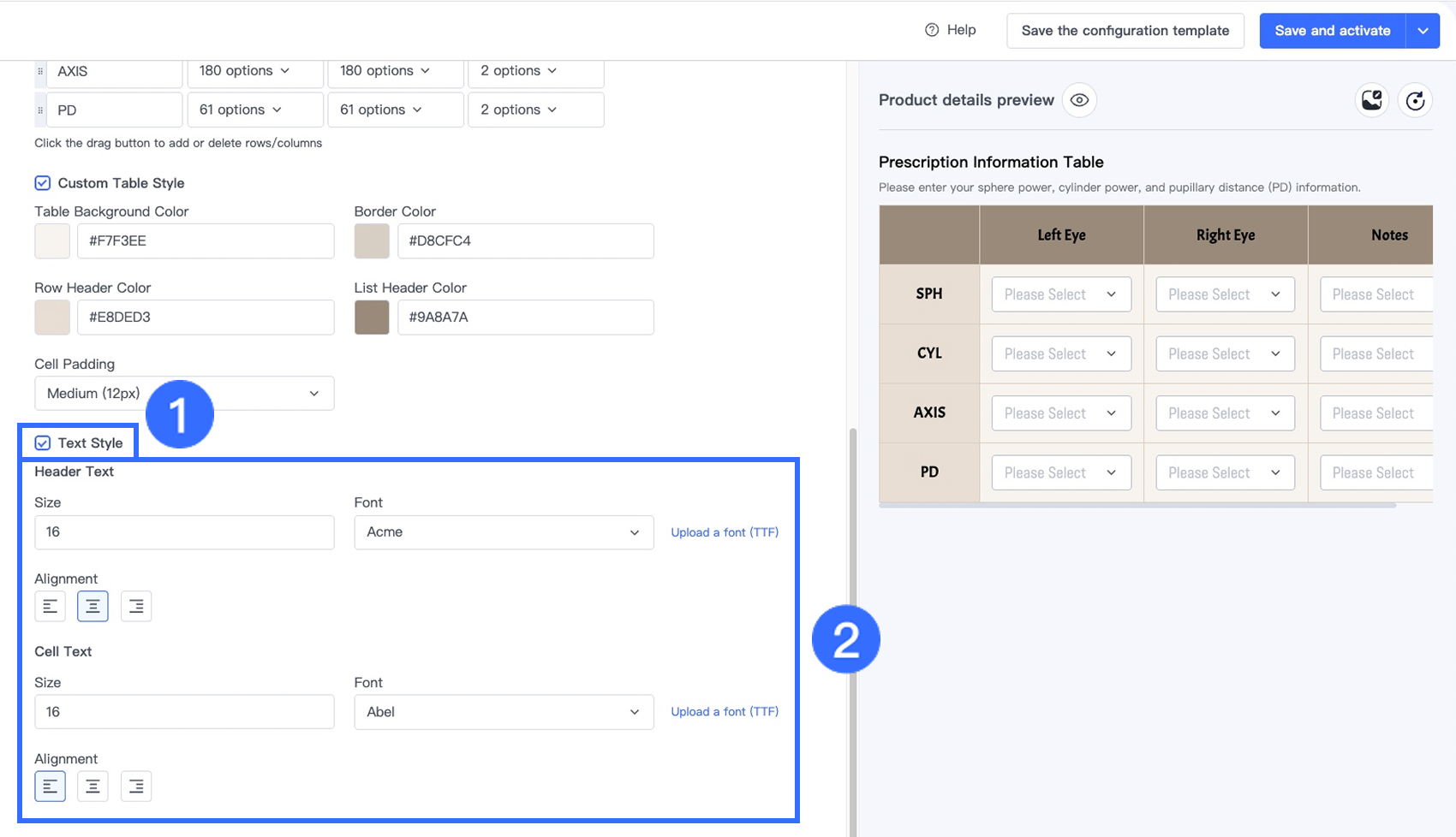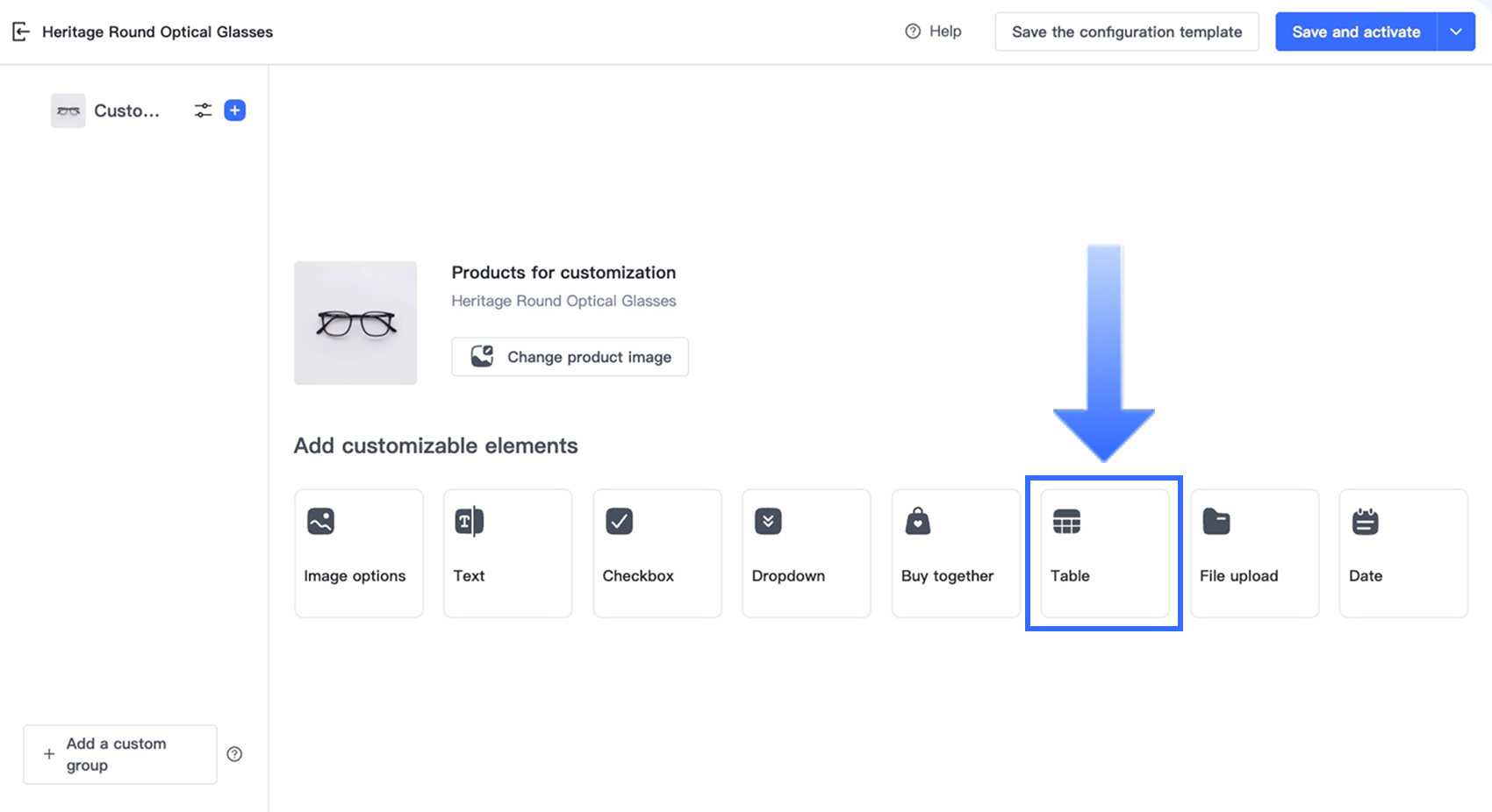 Trong trình thiết kế tùy chọn cho sản phẩm tùy chỉnh, bạn có thể thêm tùy chọn Bảng và cấu hình các cài đặt cơ bản: