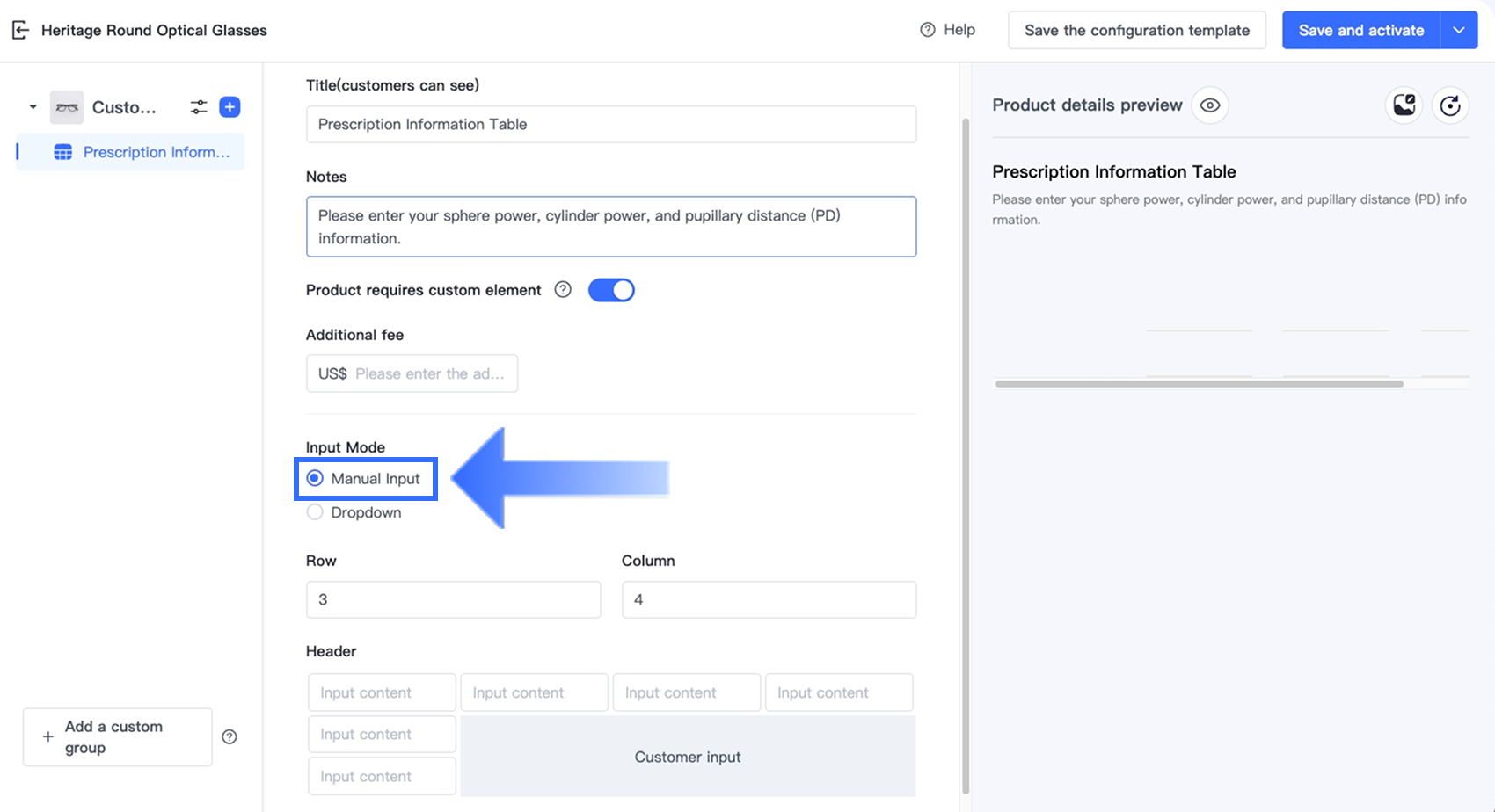 - Sản phẩm yêu cầu phần tử tùy chỉnh: Bật tùy chọn này để bắt buộc phải điền bảng.