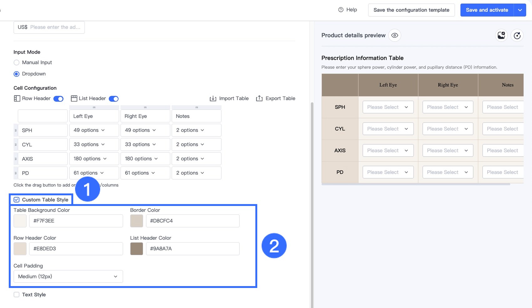 Bạn có thể nhấp vào Kiểu Bảng Tùy Chỉnh để điều chỉnh giao diện bảng sao cho phù hợp với chủ đề cửa hàng của bạn, bao gồm: