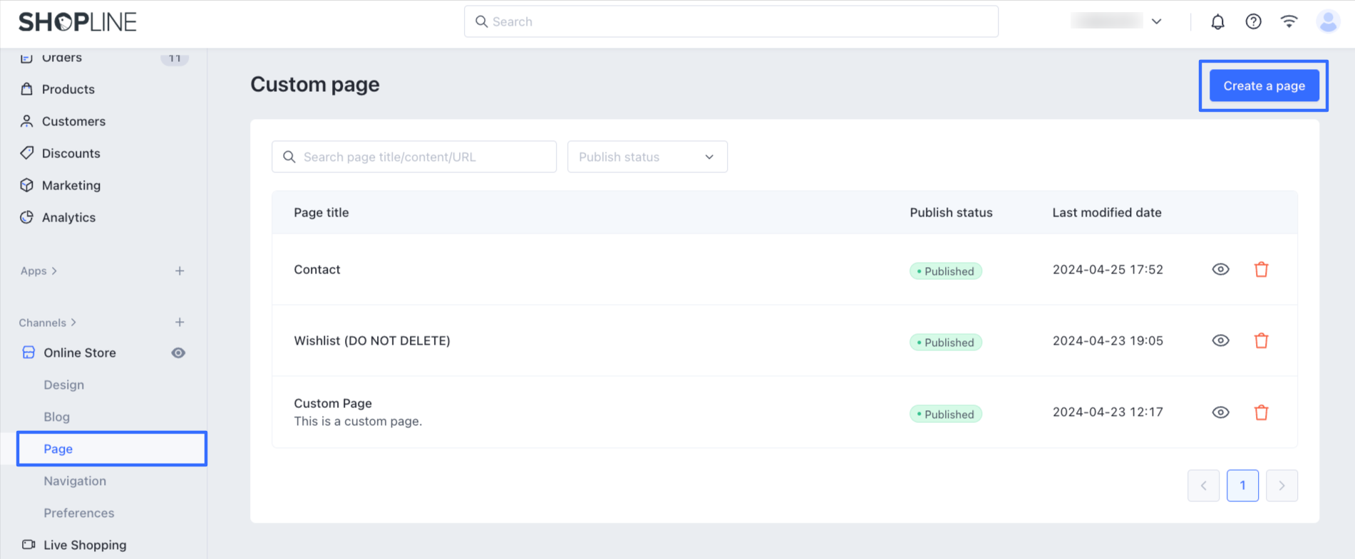 - Từ bảng điều khiển quản trị SHOPLINE của bạn, đi đến Cửa hàng trực tuyến > Trang > Tạo một trang.
