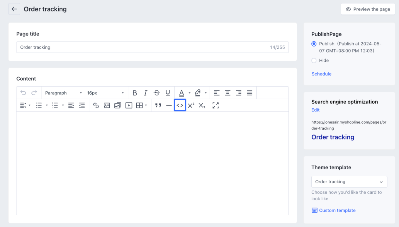 Lưu ý: Trình chỉnh sửa mã nguồn HTML được hỗ trợ trong tất cả các phiên bản của các mẫu cửa hàng SHOPLINE. - Trong danh sách trang tùy chỉnh, tìm trang theo dõi mà bạn vừa tạo và nhấp vào biểu tượng mắt để xem trước widget.