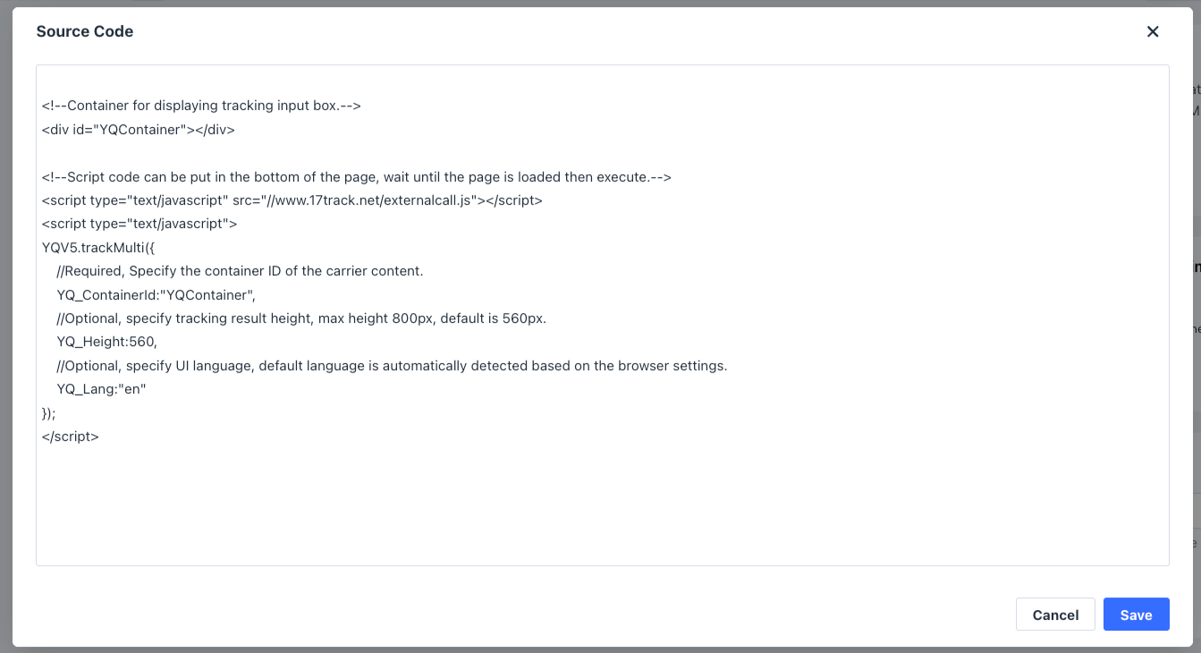 Sao chép mã theo dõi của bên thứ ba liên quan (ví dụ: từ 17 Track) vào khu vực mã nguồn HTML, sau đó nhấp vào Lưu. Để biết thêm mã theo dõi, vui lòng tham khảo hướng dẫn của nhà cung cấp.