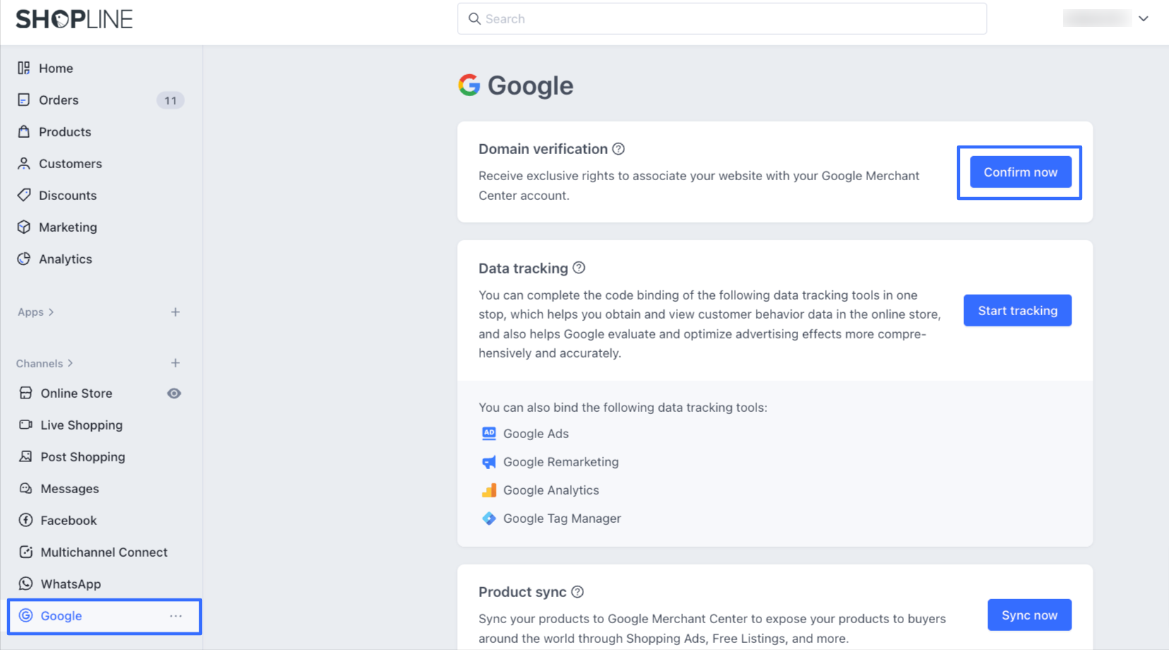 Nhấp vào Kênh và chọn Google trong thanh công cụ bên trái. Nhập kênh Google và nhấp vào Xác nhận ngay dưới phần xác minh miền.